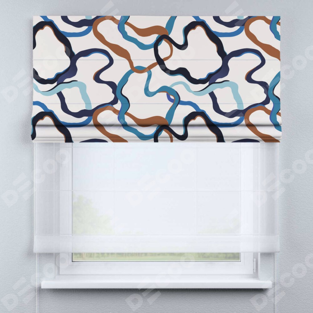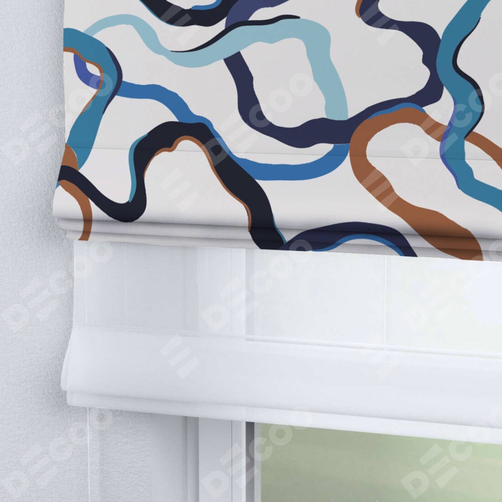 Римская штора день-ночь производителя «Cortin», используется для проёма, пошита из двух полотен, с лицевой блэкаут с нанесением сублимационной печати «Волнистые ленты», вторая ткань тюль (по стандарту комплектуется тюль белого цвета артикул V-01). Имеет универсальный механизм и подходит для монтажа: на потолок, на стену и в нишу.