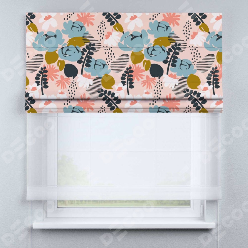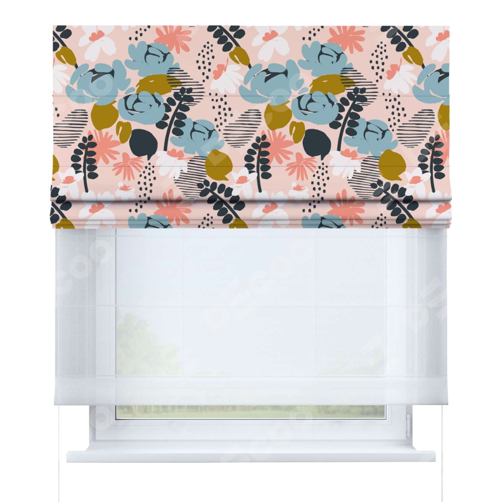 Римская штора день-ночь производителя «Cortin», используется для проёма, пошита из двух полотен, с лицевой блэкаут с нанесением сублимационной печати «Дивные цветы», вторая ткань тюль (по стандарту комплектуется тюль белого цвета артикул V-01). Имеет универсальный механизм и подходит для монтажа: на потолок, на стену и в нишу.