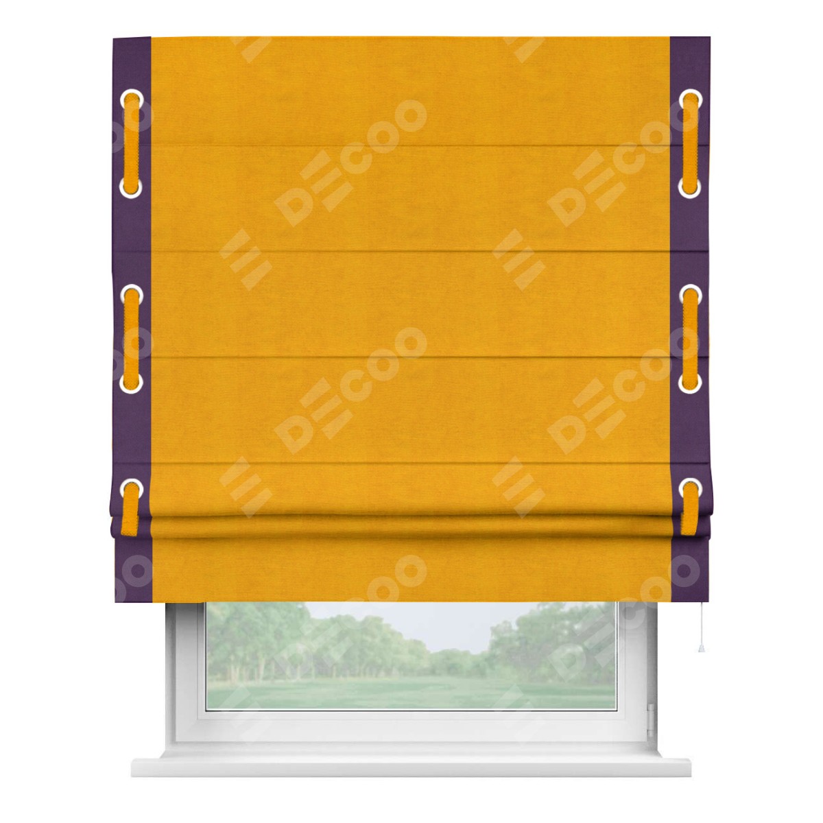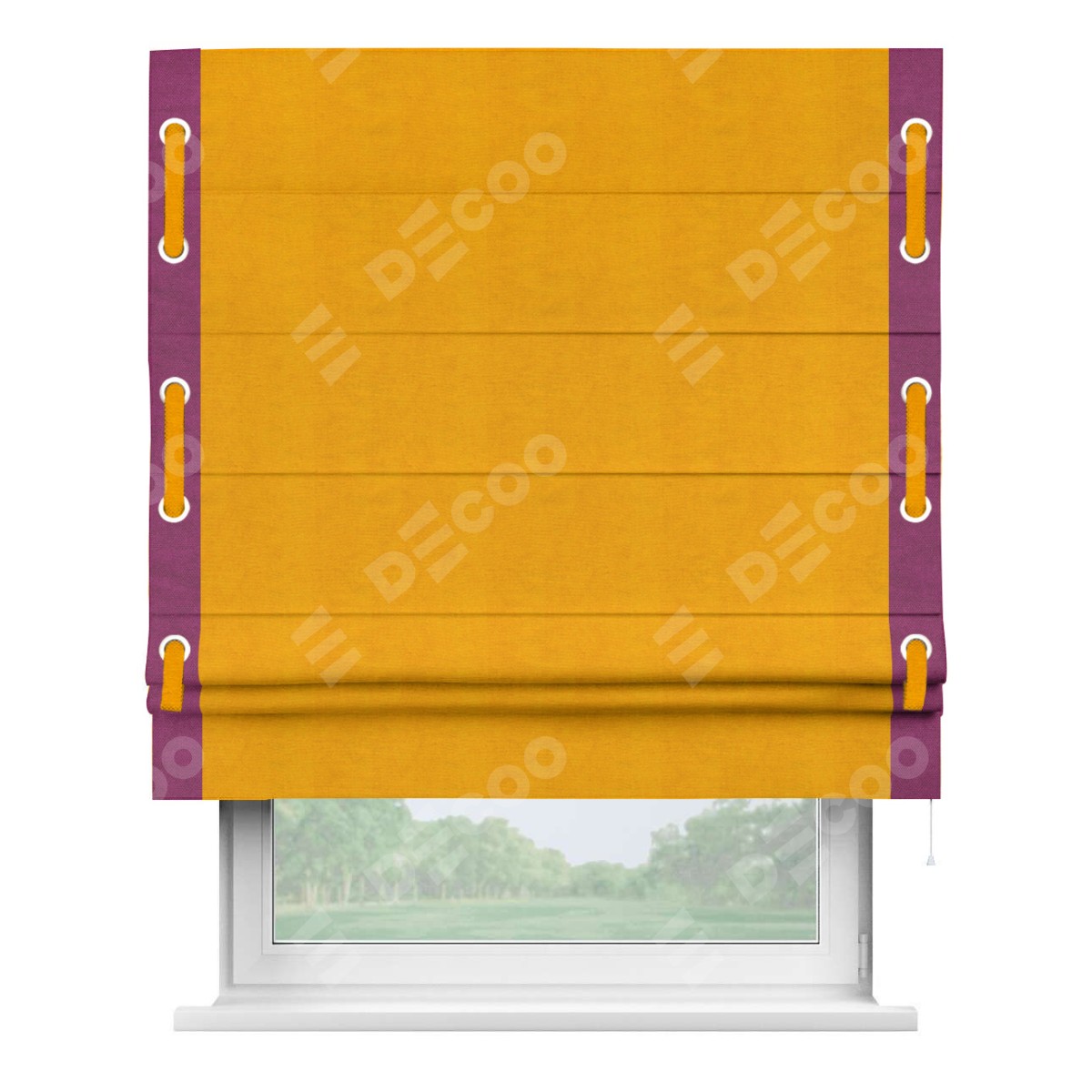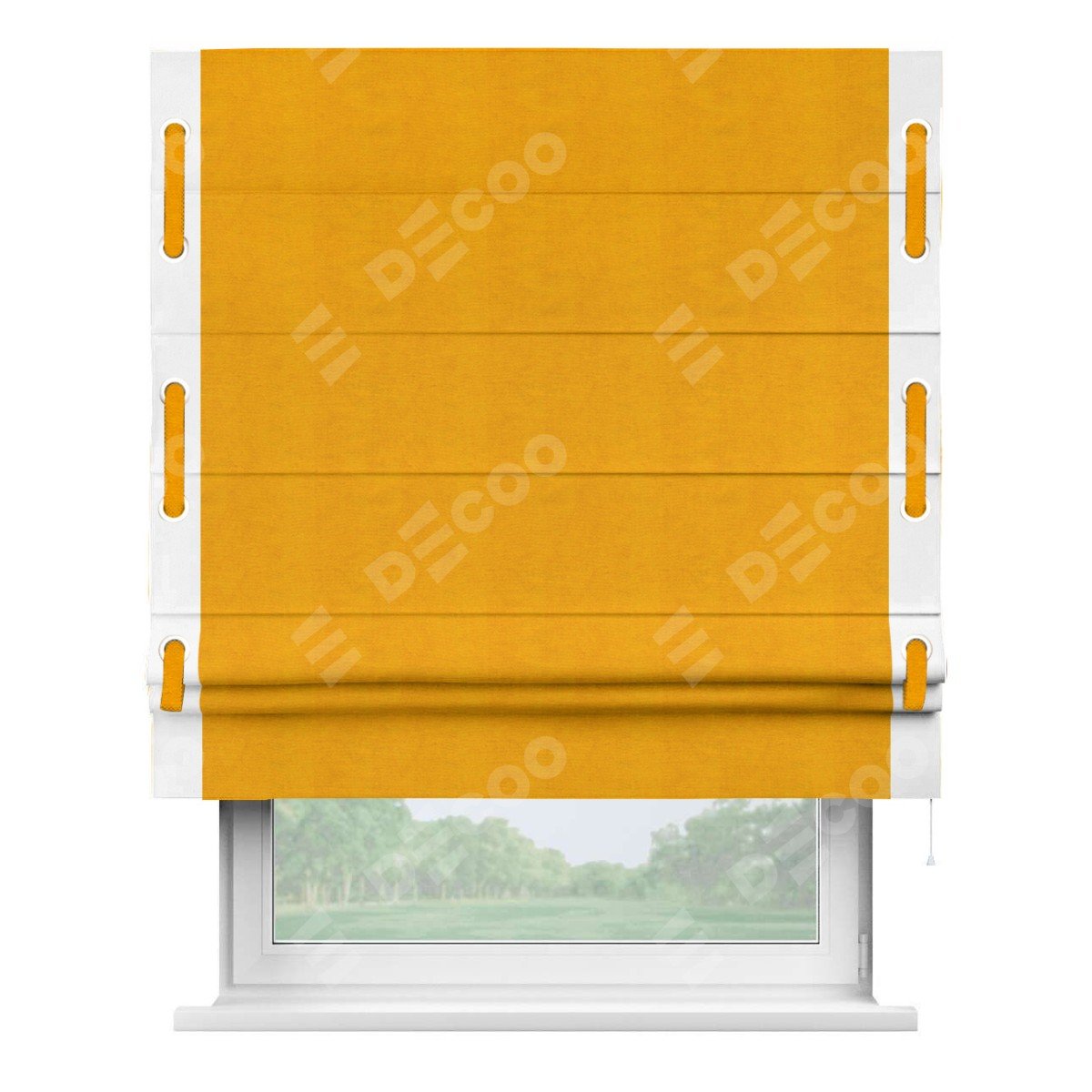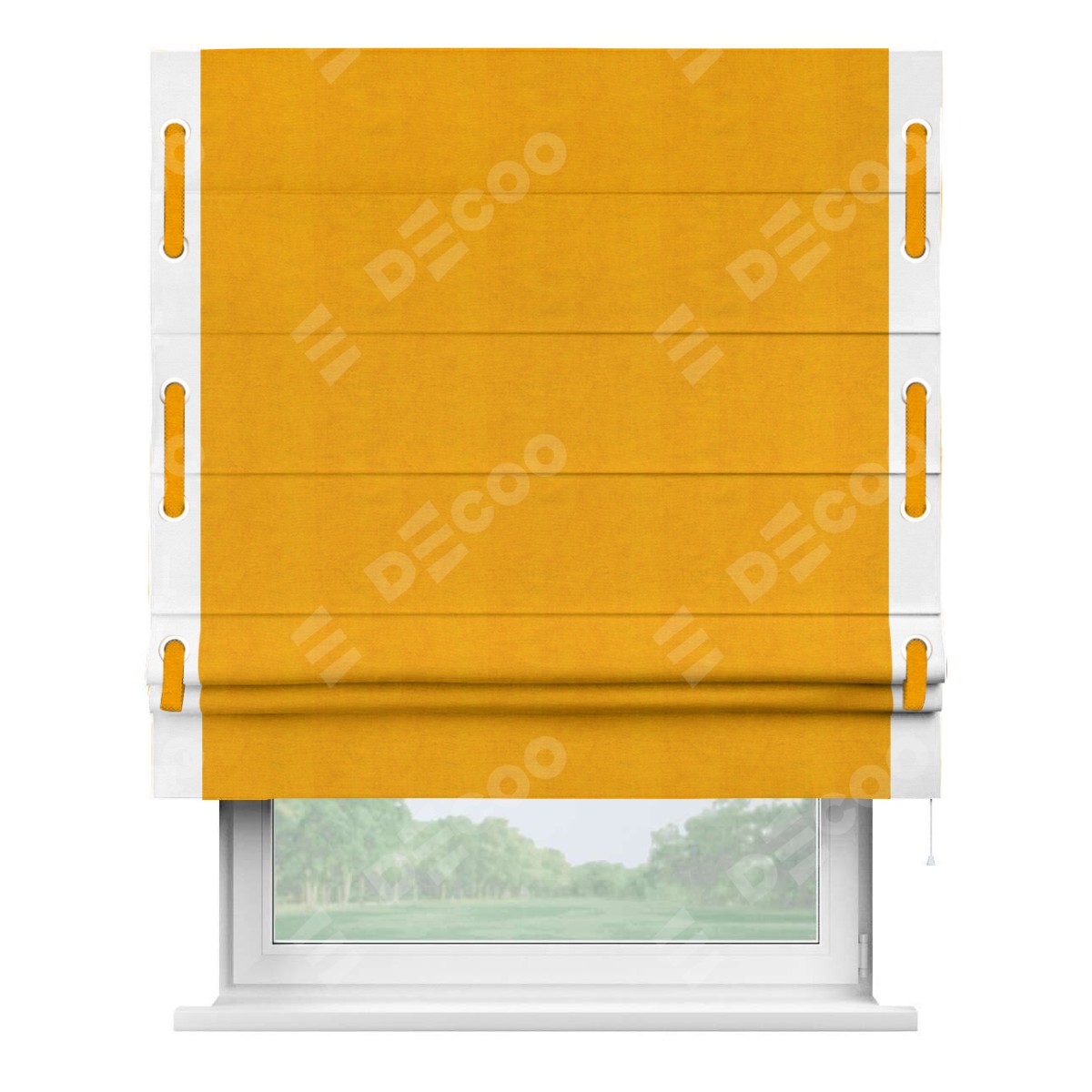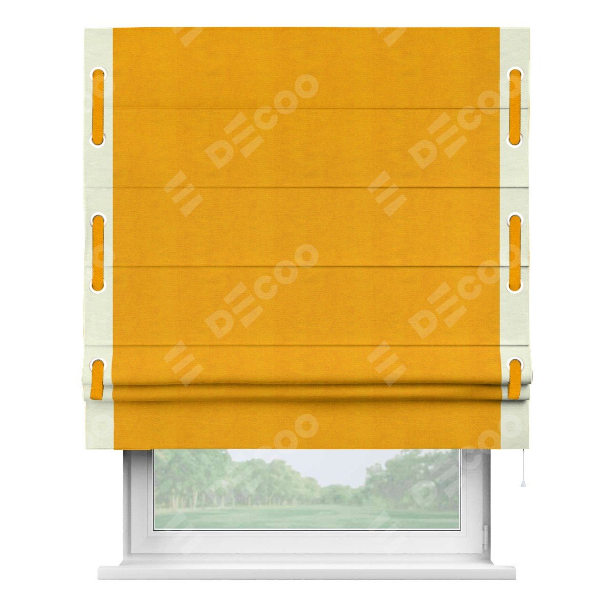 Римская штора производителя «Cortin», используется для проёма, пошита из ткани вельвет желтый, артикул ткани 85547. Отделка шторы кантом «Стрим Дуо» на кантах расположены люверсы с пояском, ткань для канта используется из вельвета разной расцветки на выбор. Ткань для пояска обычно используется из основной ткани шторы, а так же можно сделать из любой расцветки по желанию. Имеет универсальный механизм и подходит для монтажа: на потолок, на стену и в нишу.