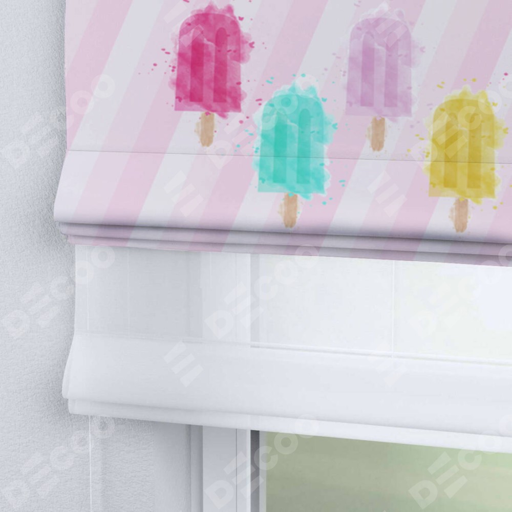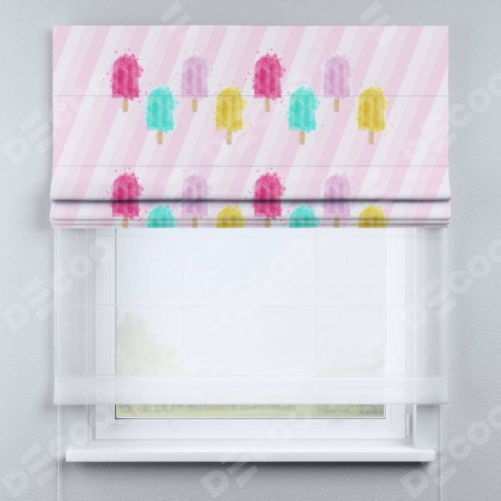 Римская штора день-ночь производителя «Cortin», используется для проёма, пошита из двух полотен, с лицевой блэкаут с нанесением сублимационной печати «Фруктовое мороженое», вторая ткань тюль (по стандарту комплектуется тюль белого цвета артикул V-01). Имеет универсальный механизм и подходит для монтажа: на потолок, на стену и в нишу.