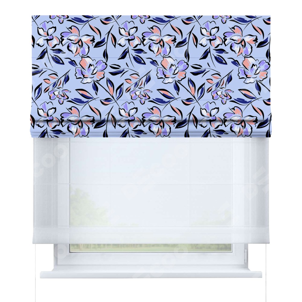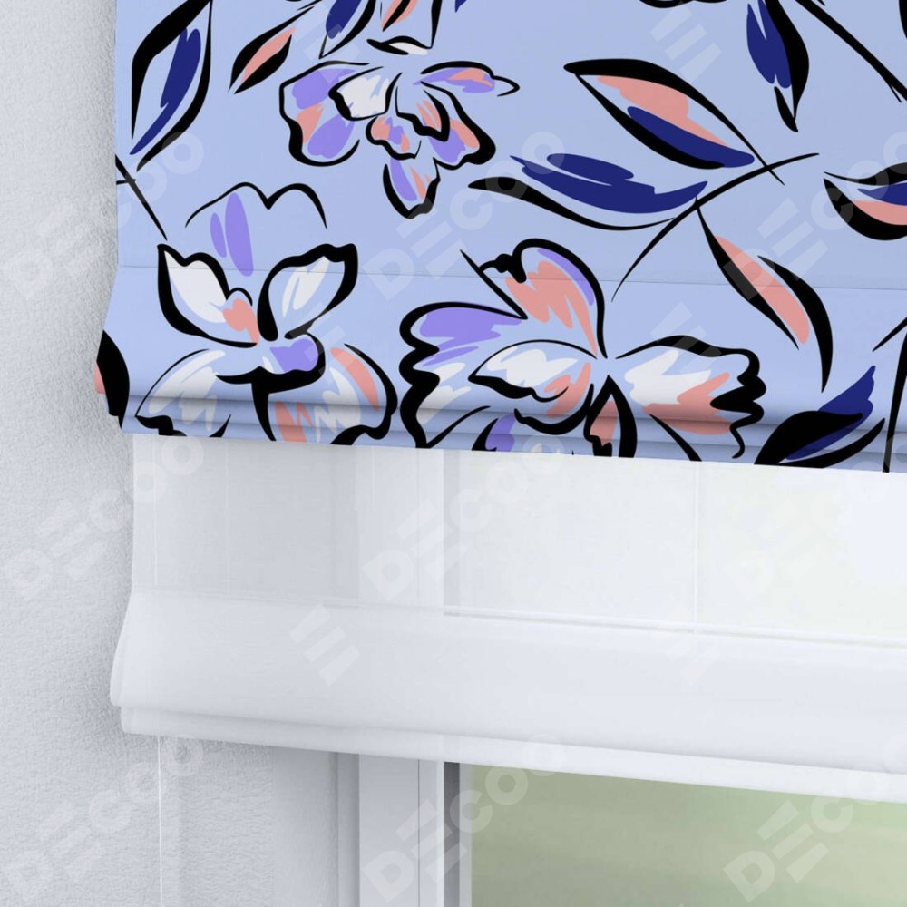 Римская штора день-ночь производителя «Cortin», используется для проёма, пошита из двух полотен, с лицевой блэкаут с нанесением сублимационной печати «Цветочки и листочки», вторая ткань тюль (по стандарту комплектуется тюль белого цвета артикул V-01). Имеет универсальный механизм и подходит для монтажа: на потолок, на стену и в нишу.