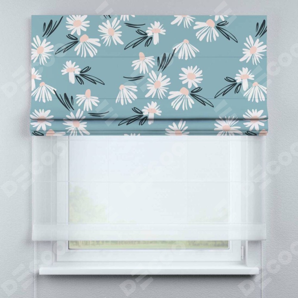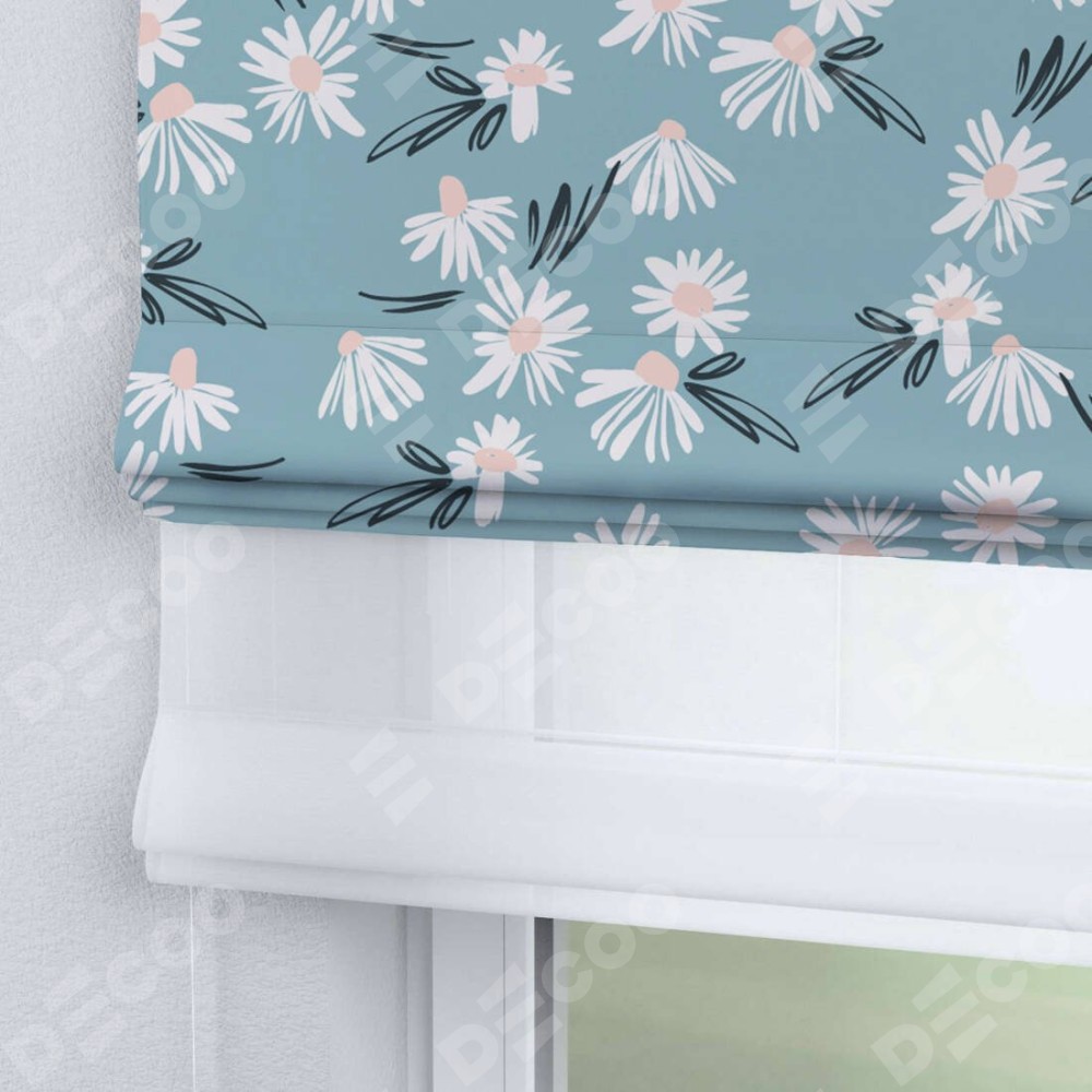 Римская штора день-ночь производителя «Cortin», используется для проёма, пошита из двух полотен, с лицевой блэкаут с нанесением сублимационной печати «Чудесные ромашки», вторая ткань тюль (по стандарту комплектуется тюль белого цвета артикул V-01). Имеет универсальный механизм и подходит для монтажа: на потолок, на стену и в нишу.
