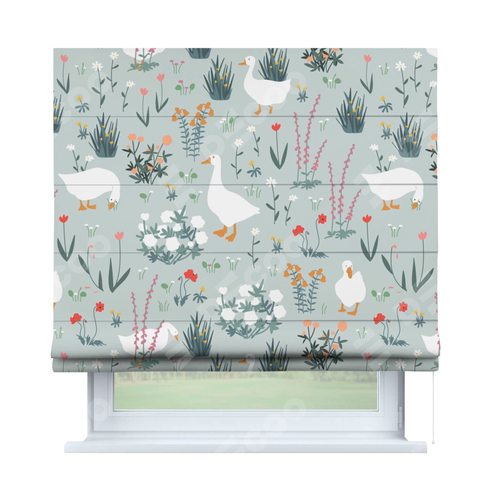 Римская штора производителя «Cortin», используется для проёма, пошита из ткани блэкаут с нанесением сублимационной печати «Гуси на лугу». Имеет универсальный механизм и подходит для монтажа: на потолок, на стену и в нишу.