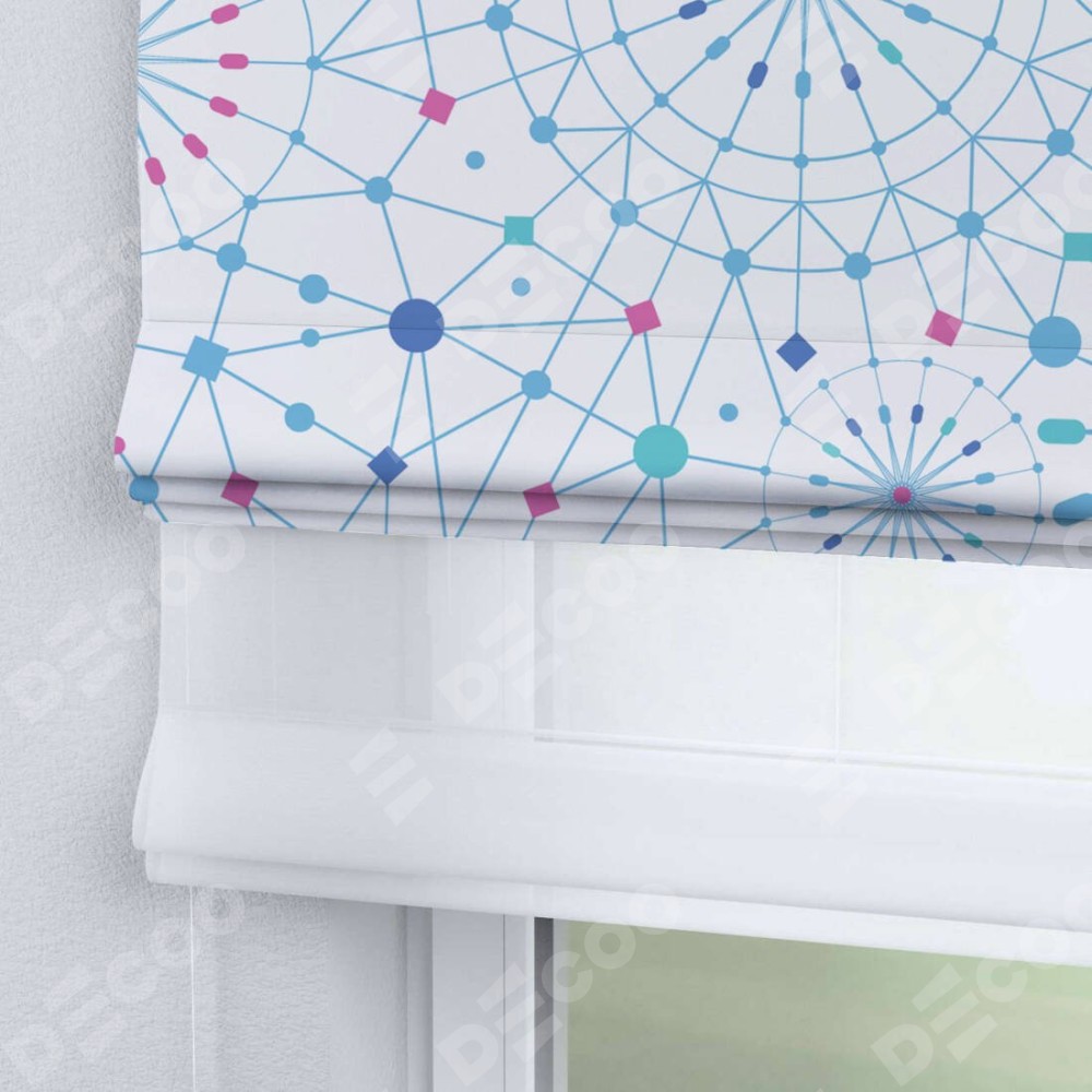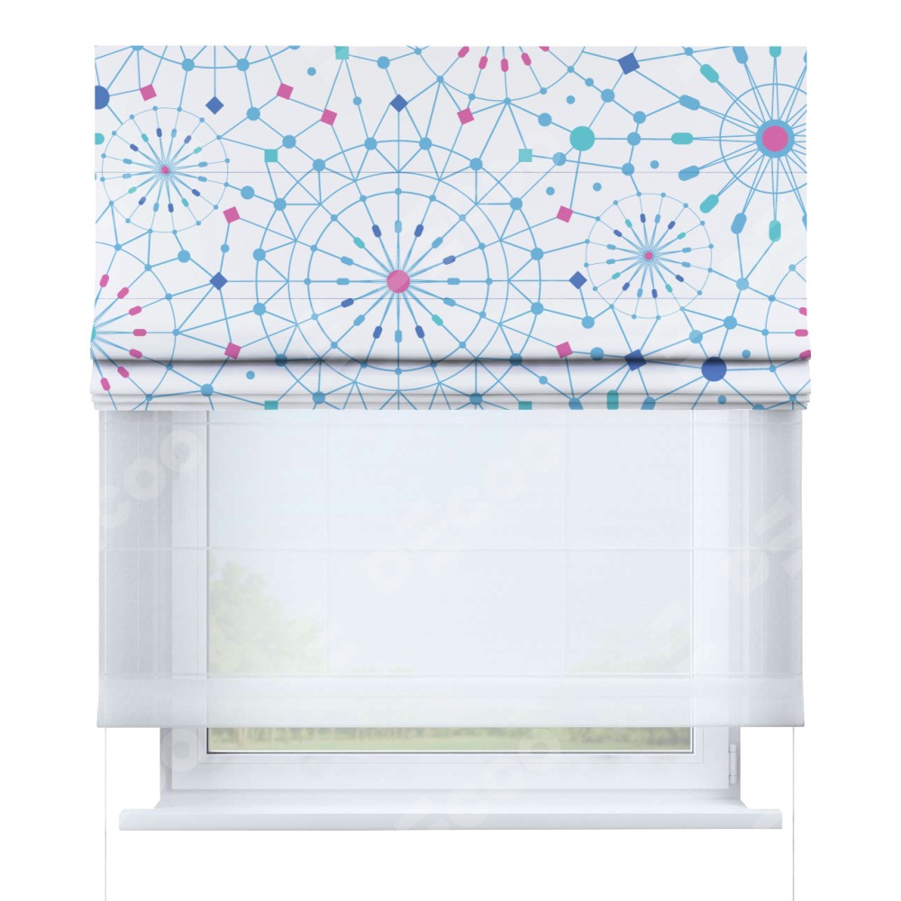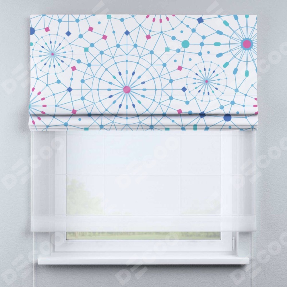 Римская штора день-ночь производителя «Cortin», используется для проёма, пошита из двух полотен, с лицевой блэкаут с нанесением сублимационной печати «Круги и линии», вторая ткань тюль (по стандарту комплектуется тюль белого цвета артикул V-01). Имеет универсальный механизм и подходит для монтажа: на потолок, на стену и в нишу.