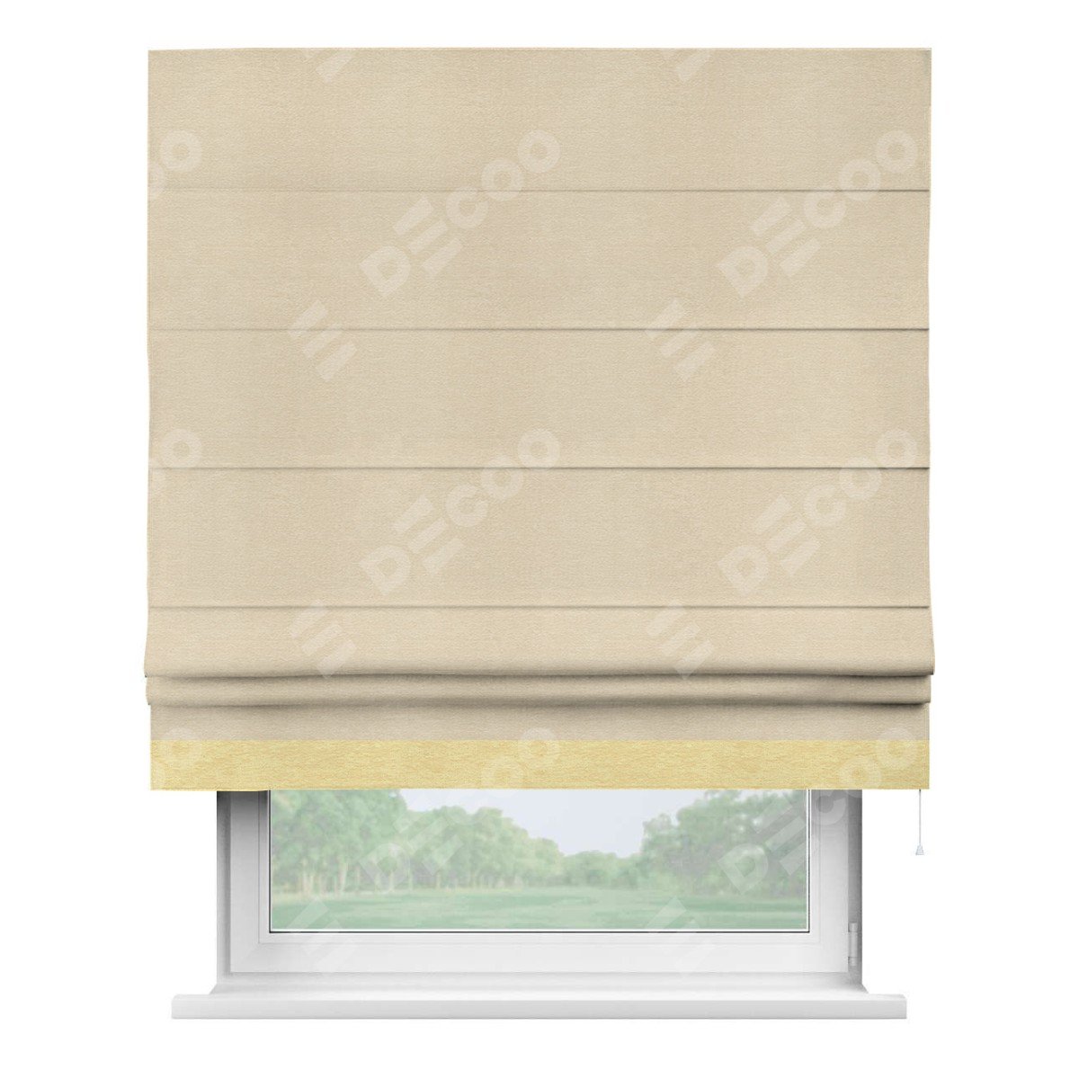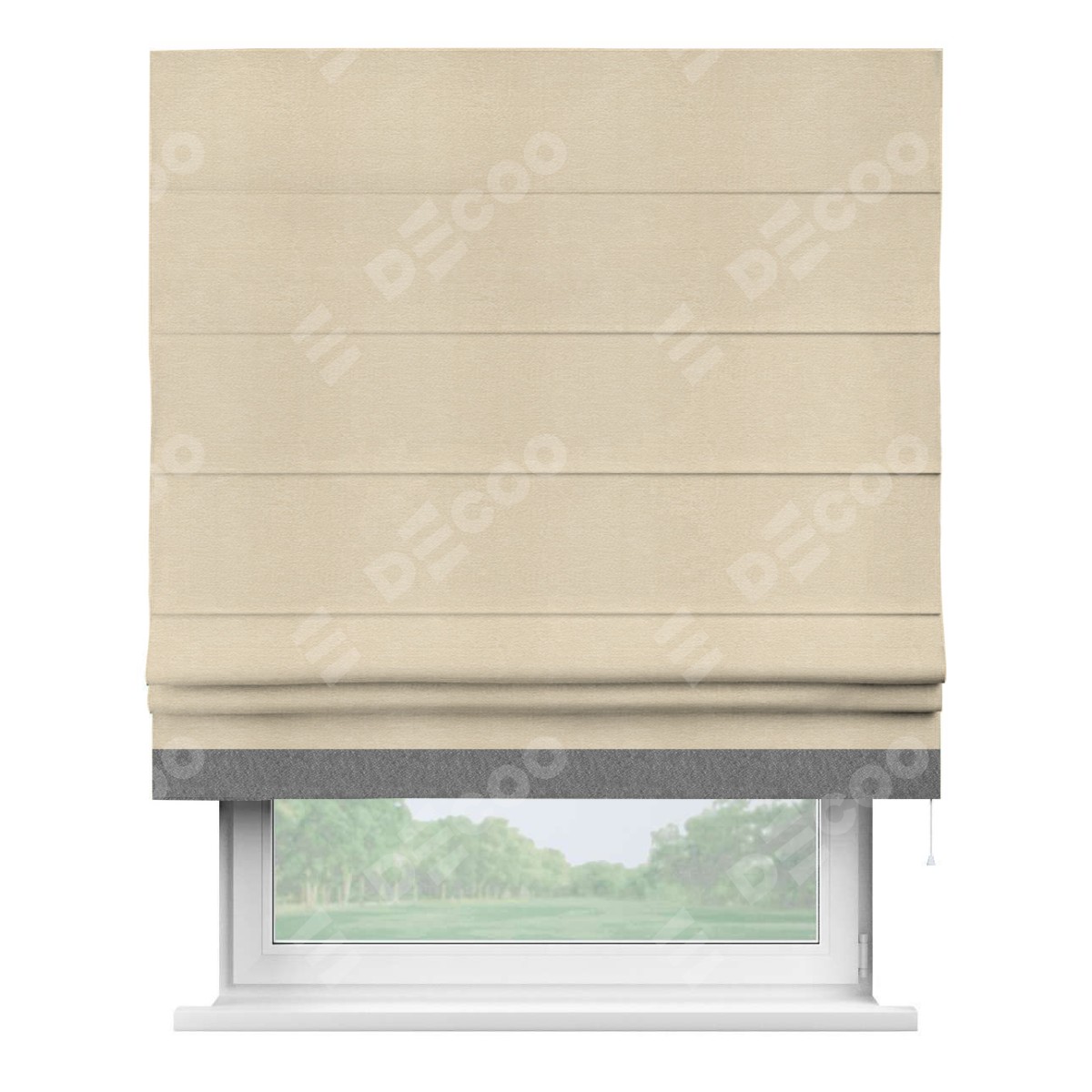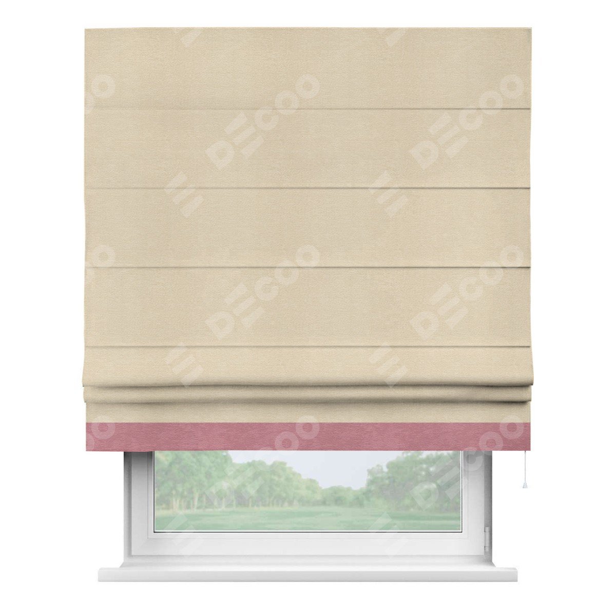 Римская штора производителя «Cortin», используется для проёма, пошита из ткани софт однотонный бежевый лайт, артикул 33100. Отделка шторы кантом «Джестер», ткань для канта используется из софта разной расцветки на выбор. Имеет универсальный механизм и подходит для монтажа: на потолок, на стену и в нишу.