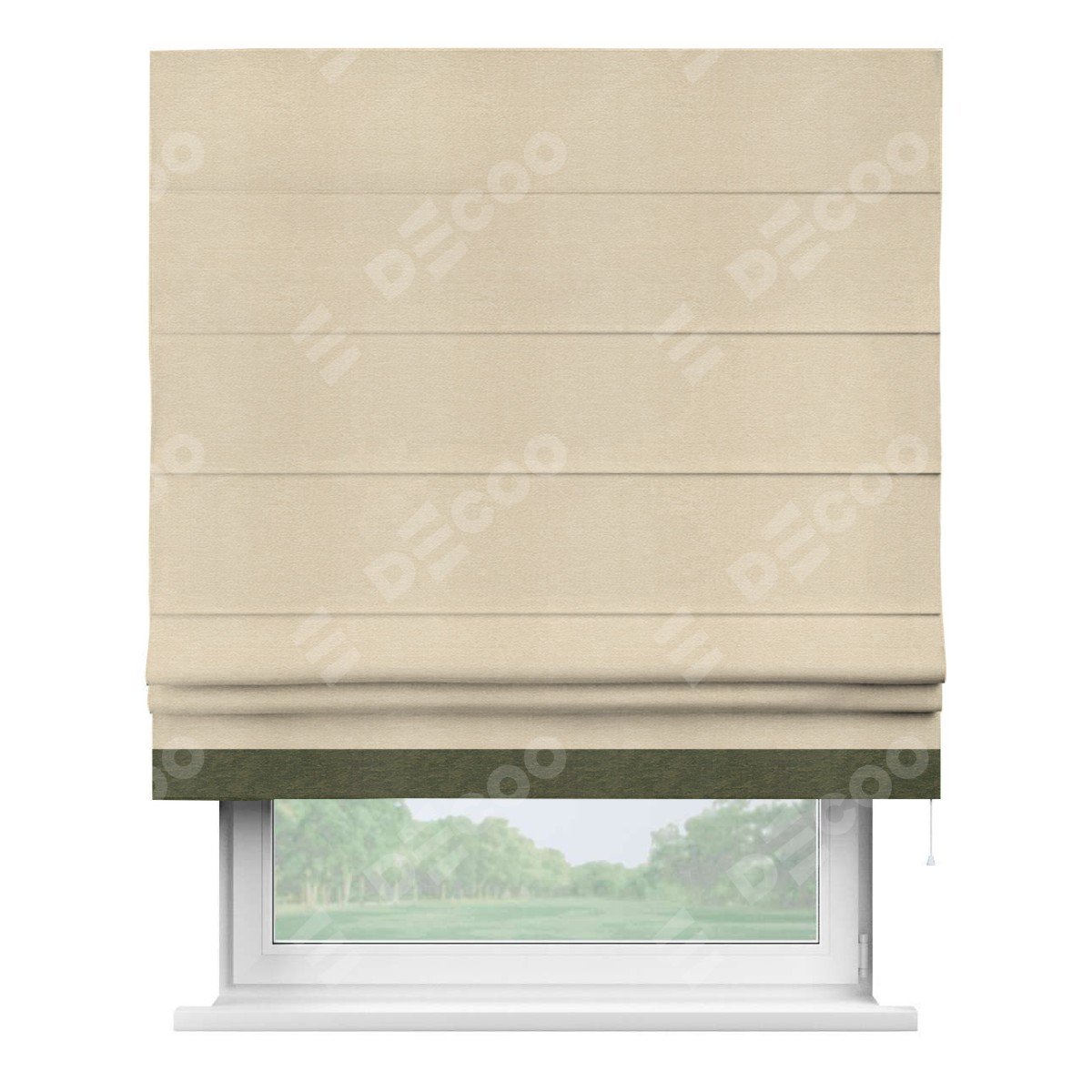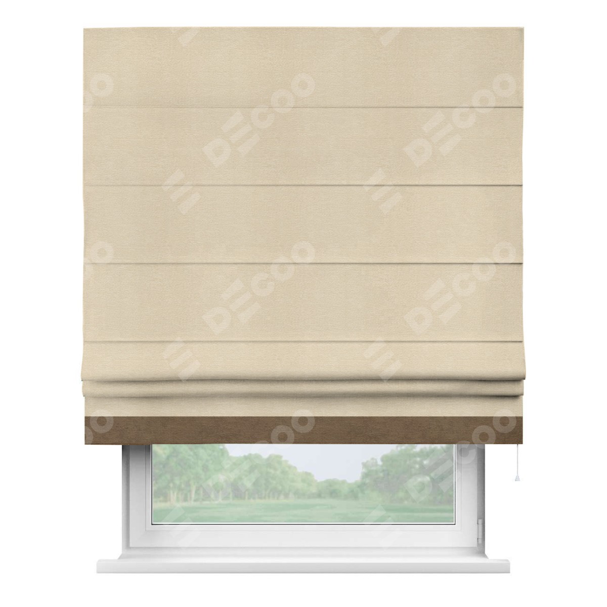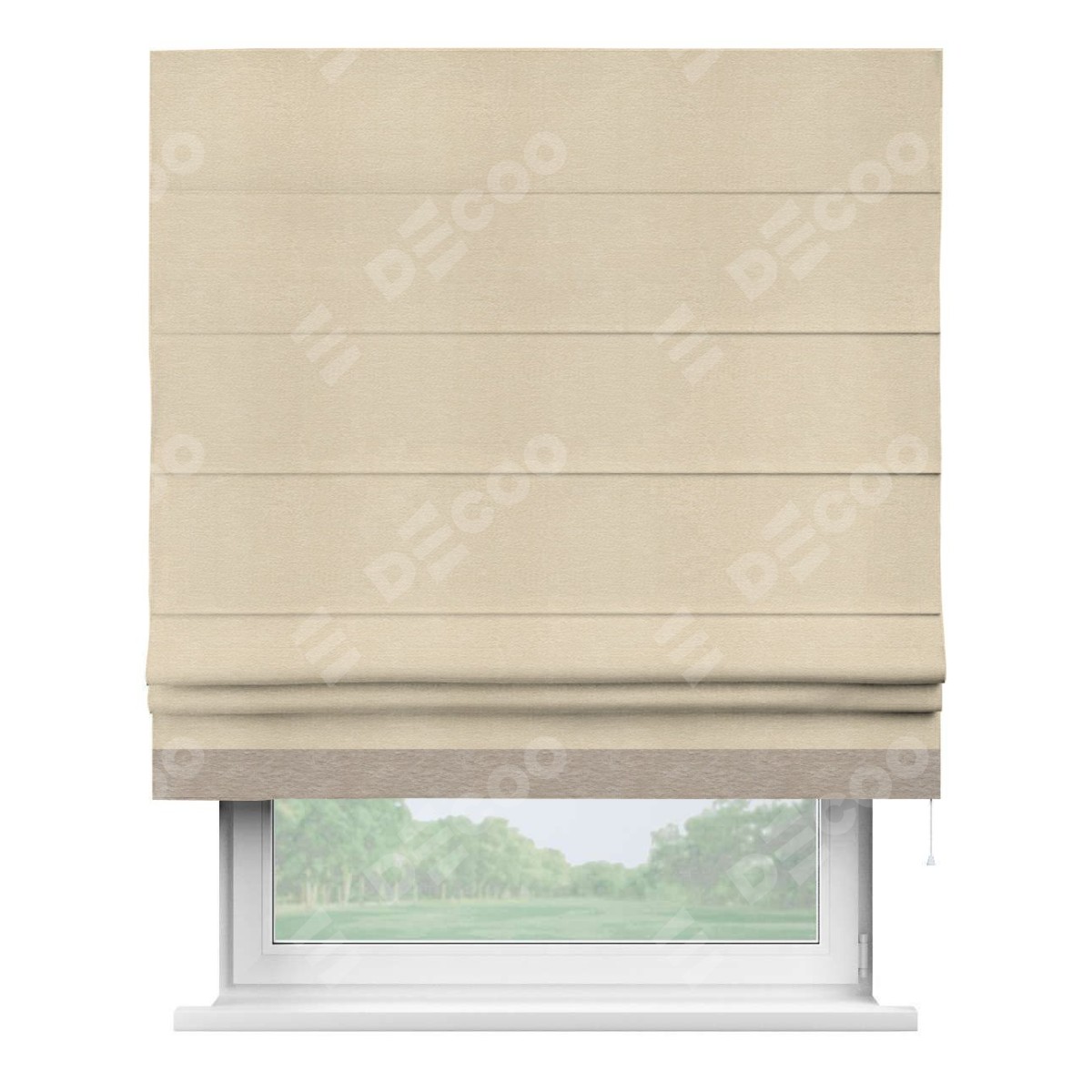Римская штора производителя «Cortin», используется для проёма, пошита из ткани софт однотонный бежевый лайт, артикул 33100. Отделка шторы кантом «Джестер», ткань для канта используется из софта разной расцветки на выбор. Имеет универсальный механизм и подходит для монтажа: на потолок, на стену и в нишу.