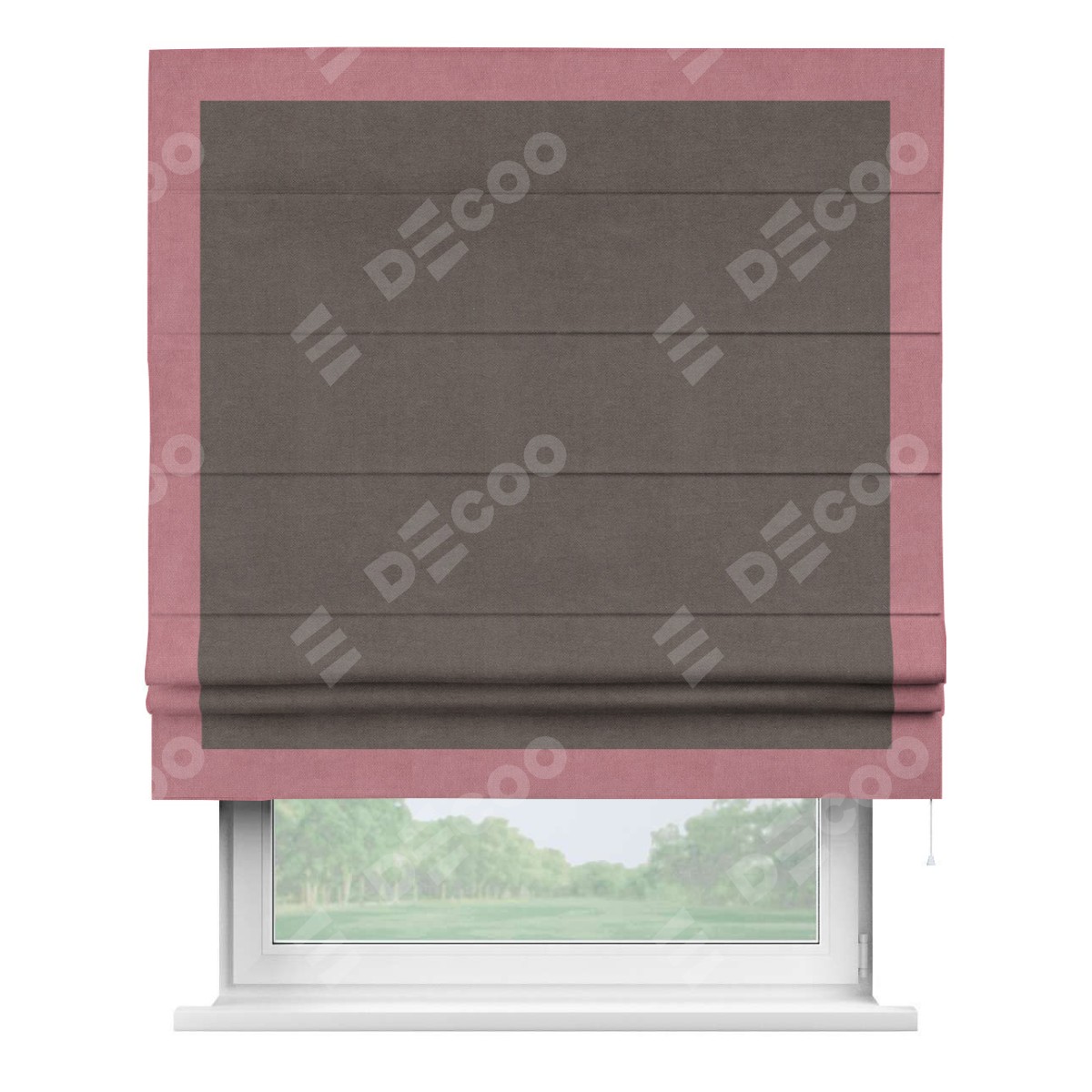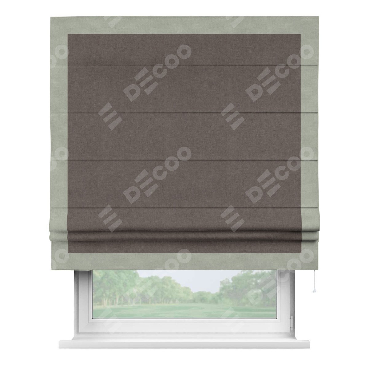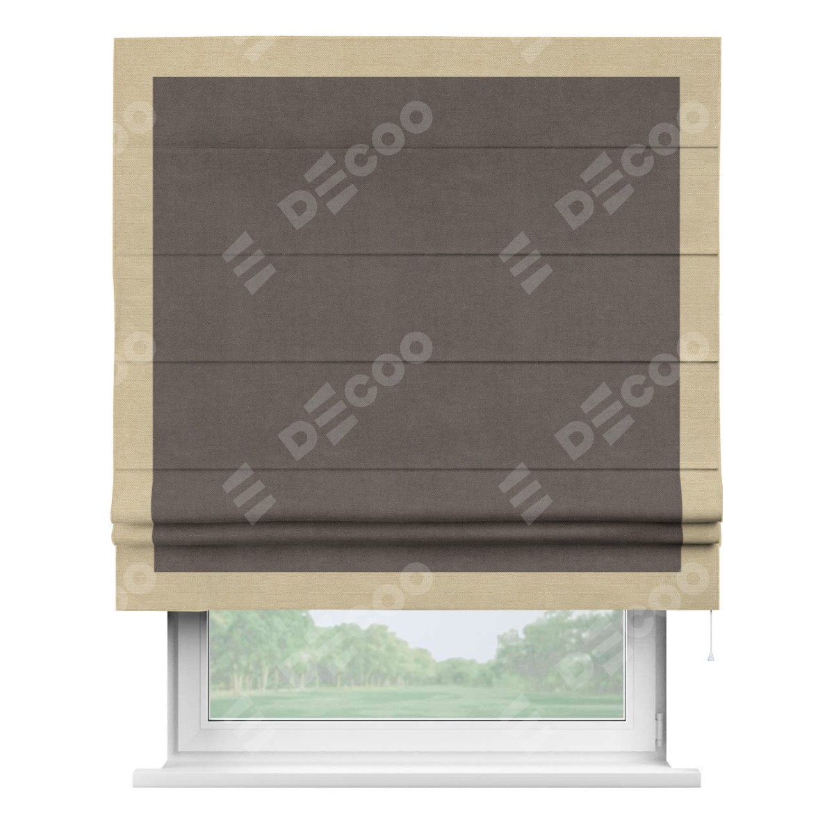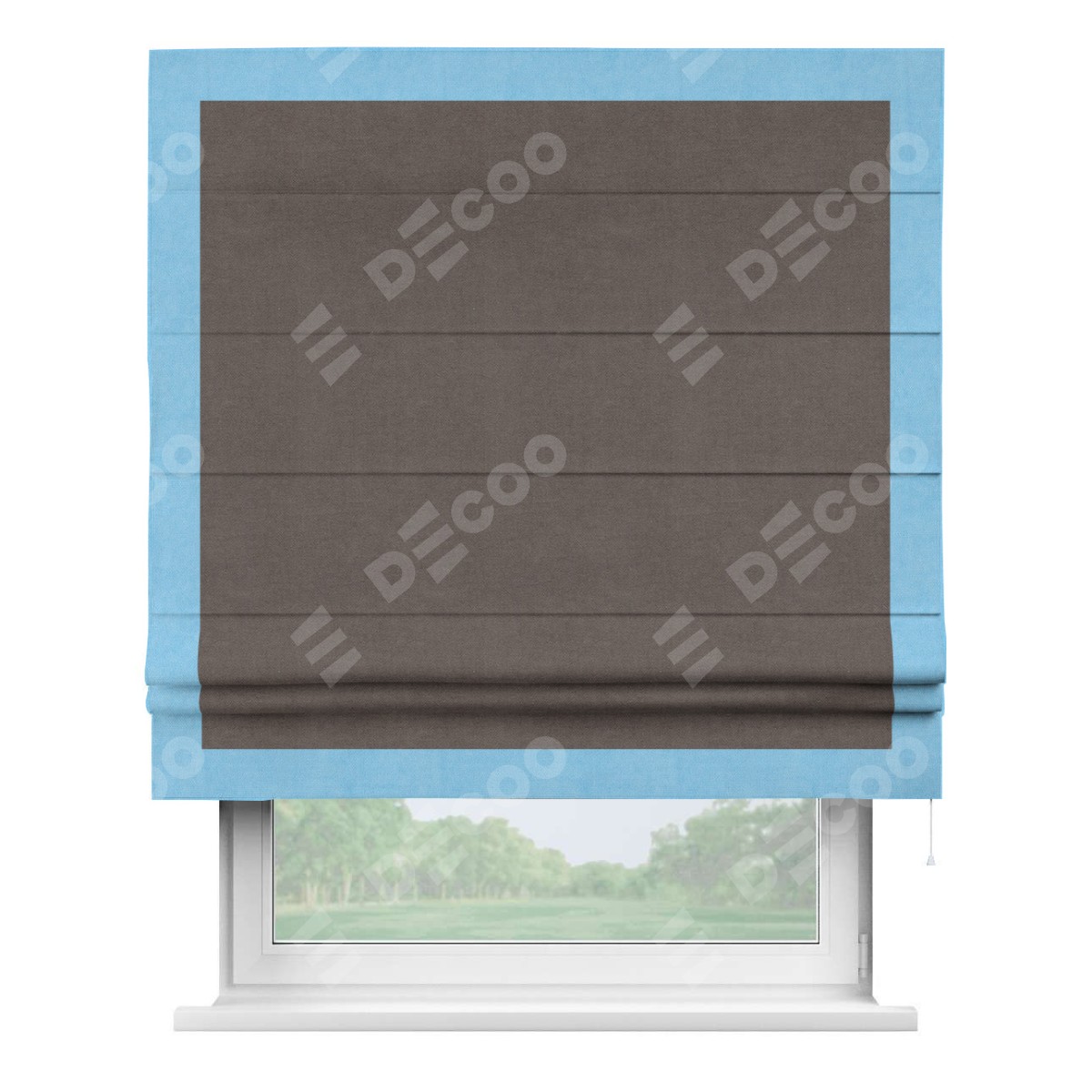 Римская штора производителя «Cortin», используется для проёма, пошита из ткани вельвет коричневый, артикул ткани 14135. Отделка шторы кантом «Чесс», ткань для канта используется из вельвета разной расцветки на выбор. Имеет универсальный механизм и подходит для монтажа: на потолок, на стену и в нишу.