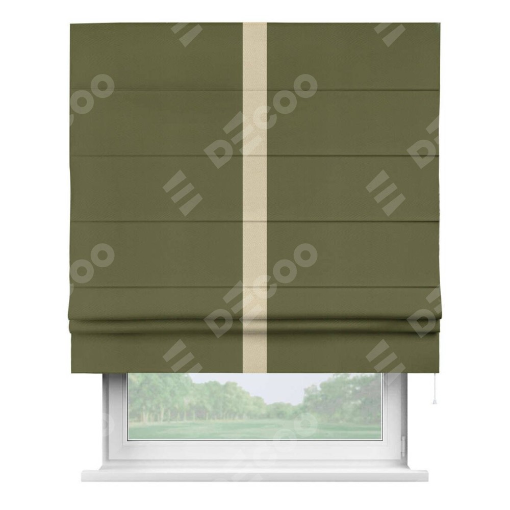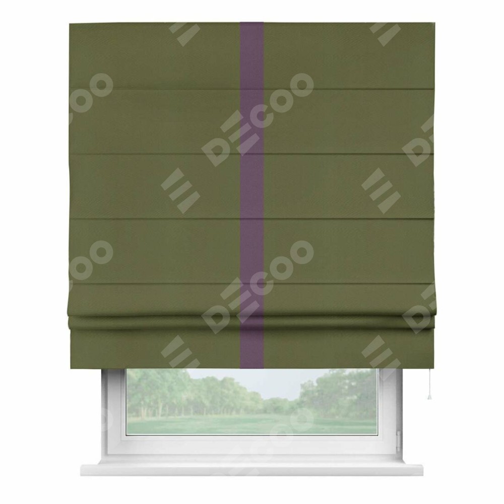 Римская штора производителя «Cortin», используется для проёма, пошита из ткани блэкаут однотонный зелёный, артикул ткани 81859. Отделка шторы кантом «Хайвей», ткань для канта используется из блэкаута однотонного разной расцветки на выбор. Имеет универсальный механизм и подходит для монтажа: на потолок, на стену и в нишу.