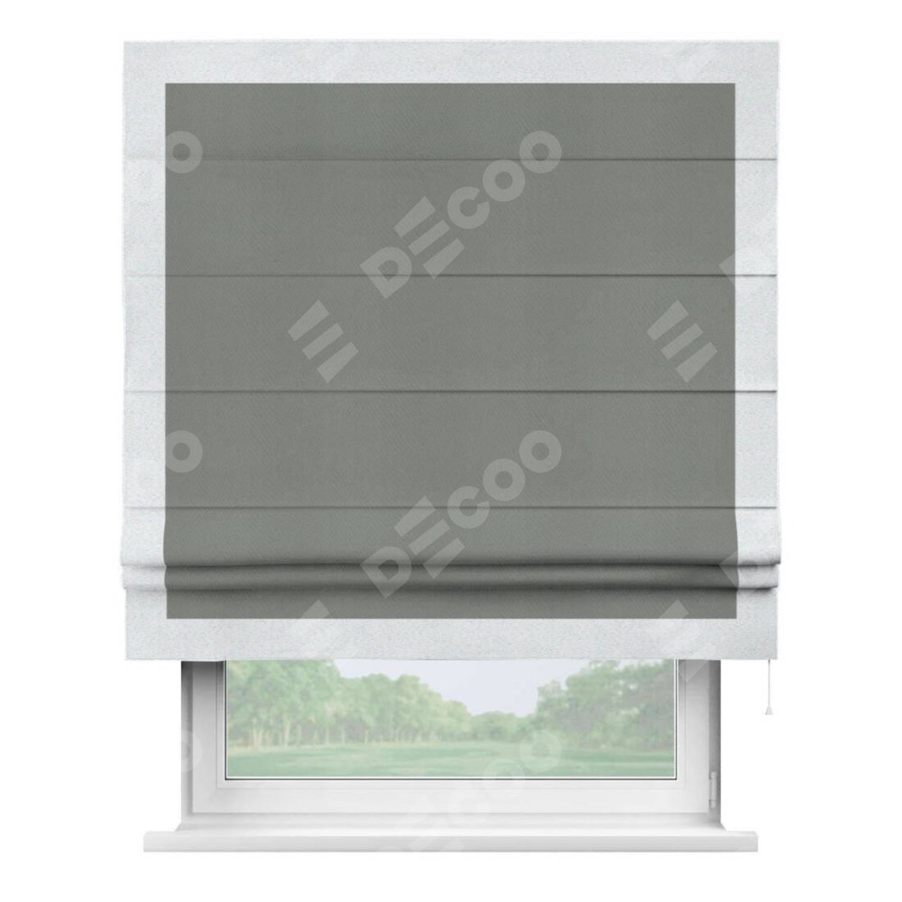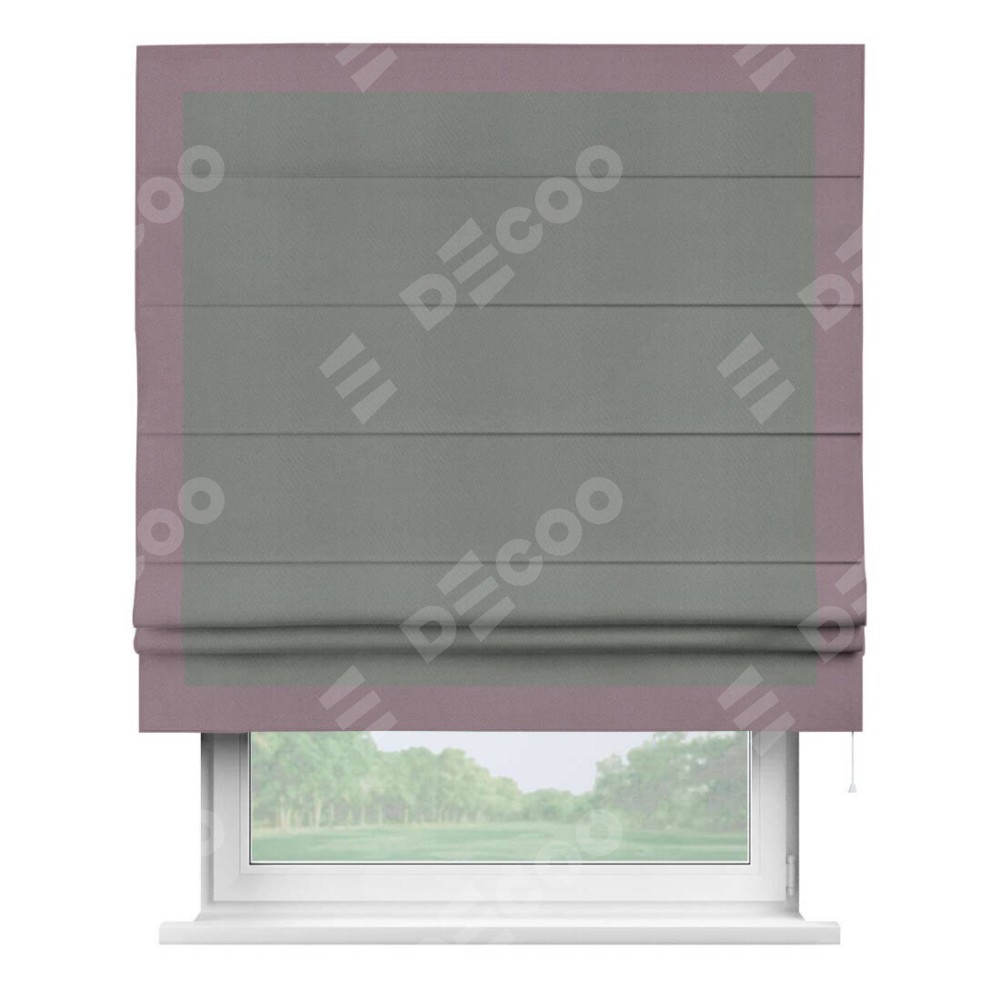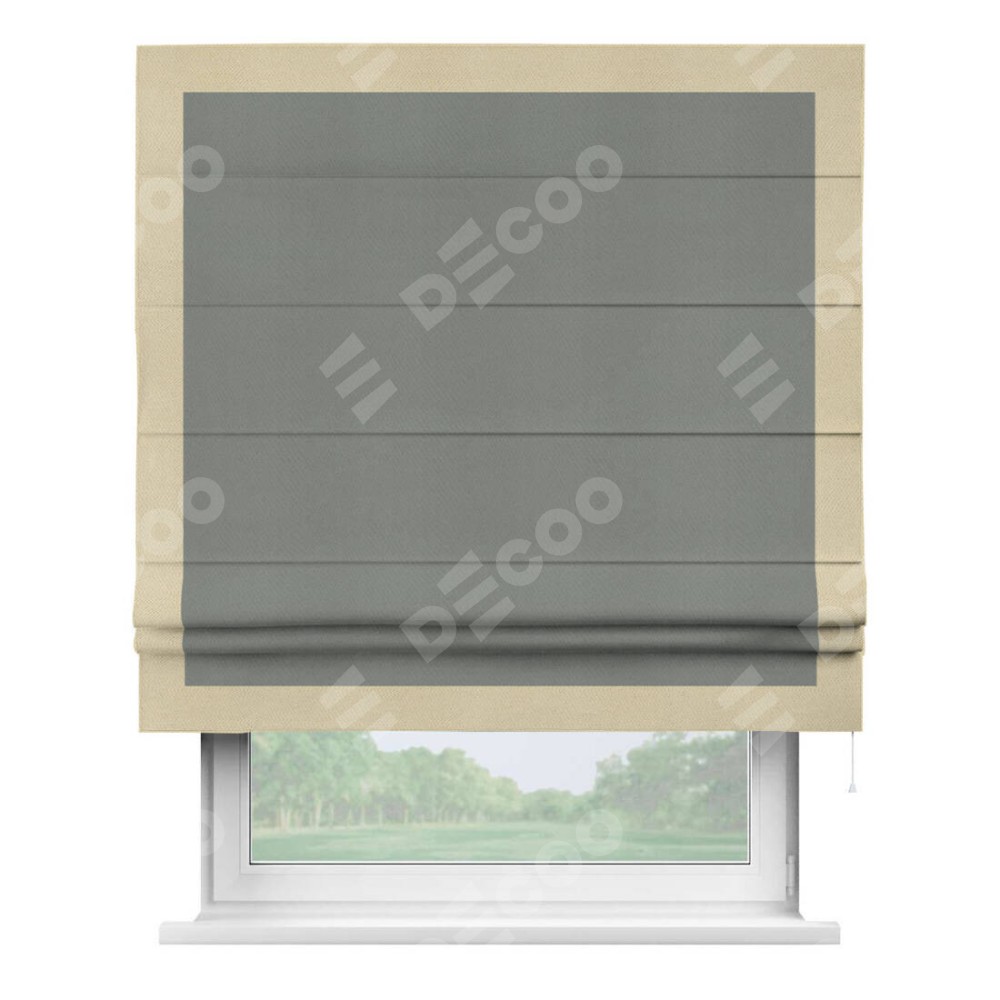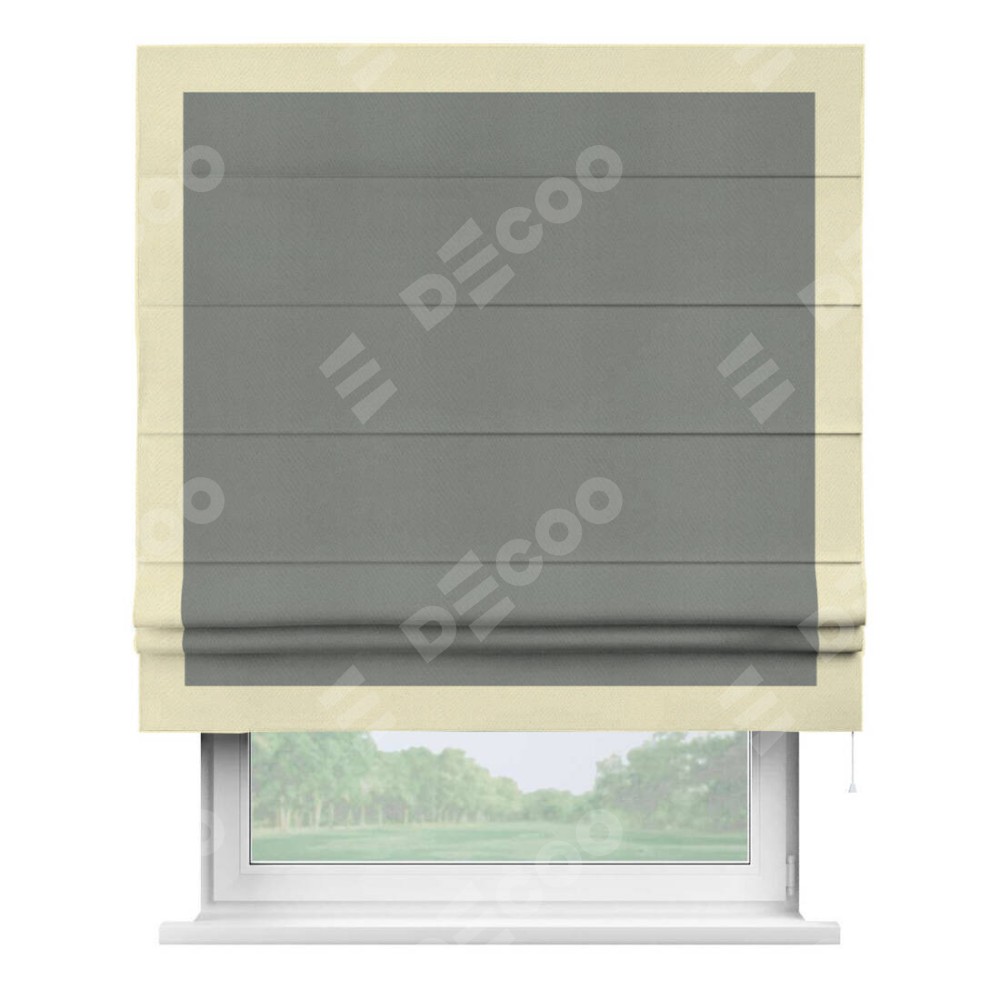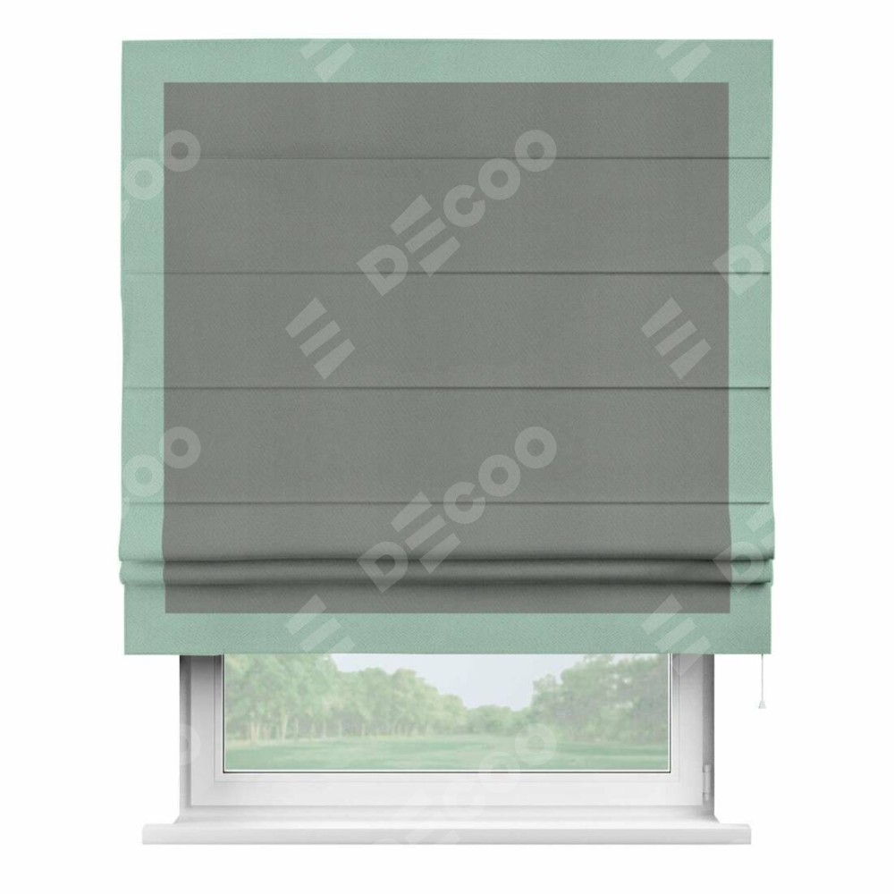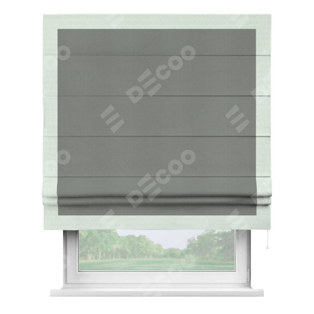 Римская штора производителя «Cortin», используется для проёма, пошита из ткани блэкаут однотонный тёмно-серый, артикул ткани 18077. Отделка шторы кантом «Чесс», ткань для канта используется из блэкаута однотонного разной расцветки на выбор. Имеет универсальный механизм и подходит для монтажа: на потолок, на стену и в нишу.