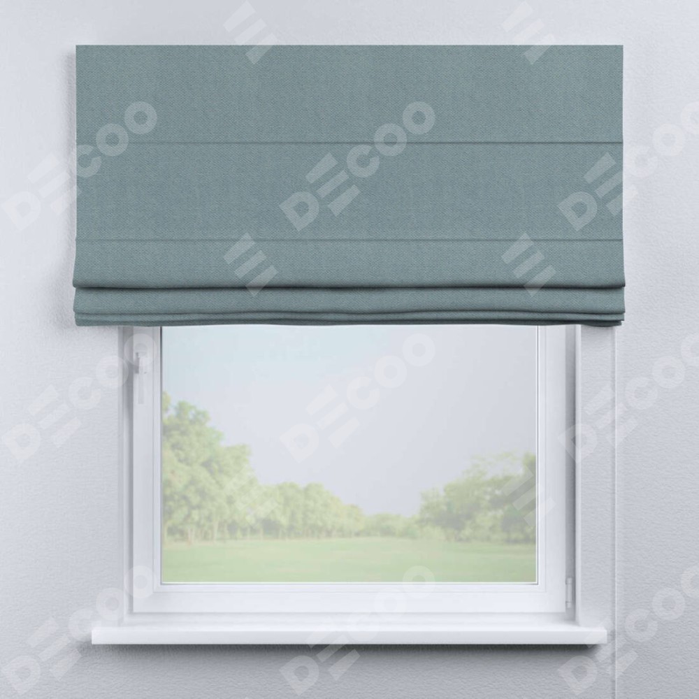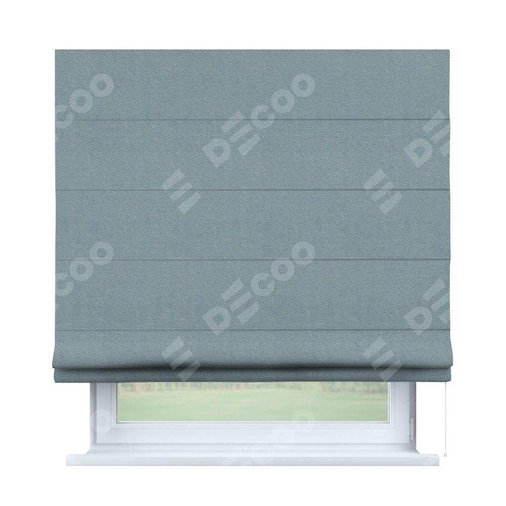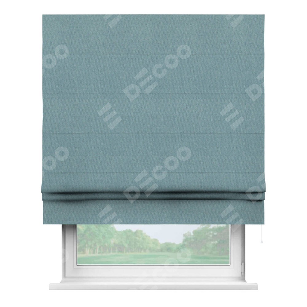 Римская штора производителя «Cortin», используется для проёма, пошита из ткани блэкаут тиснение с блеском синий, артикул ткани 34625. Изнаночная сторона материала черного цвета, что обеспечивает необходимую светонепроницаемость. Имеет универсальный механизм и подходит для монтажа: на потолок, на стену и в нишу.