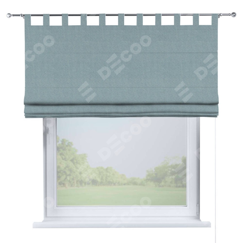 Римская штора производителя «Cortin», используется для проёма, пошита из ткани блэкаут тиснение с блеском синий, артикул ткани 34625. Изнаночная сторона материала черного цвета, что обеспечивает необходимую светонепроницаемость. Данная модель пошита на петлях, комплектуется на выбор круглым карнизом и подходит для монтажа на стену. Римская штора на петлях имеет простую систему регулировки высоты, отличительным преимуществом данной модели является простой способ монтажа. Достаточно повесить ее на трубу и штора готова!