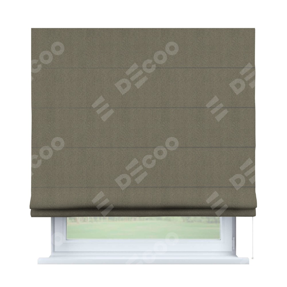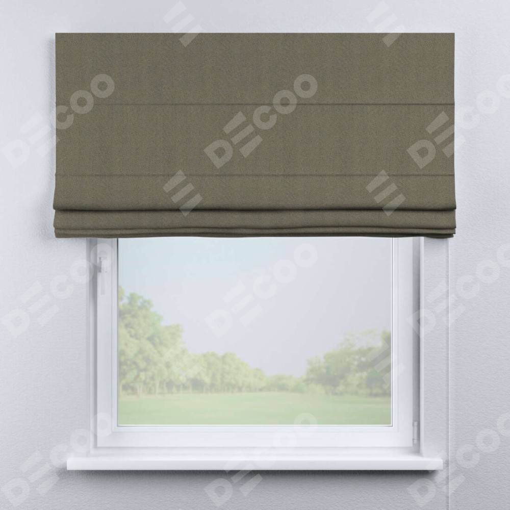 Римская штора производителя «Cortin», используется для проёма, пошита из ткани блэкаут тиснение с блеском графитовый, артикул ткани 34648. Изнаночная сторона материала черного цвета, что обеспечивает необходимую светонепроницаемость. Имеет универсальный механизм и подходит для монтажа: на потолок, на стену и в нишу.