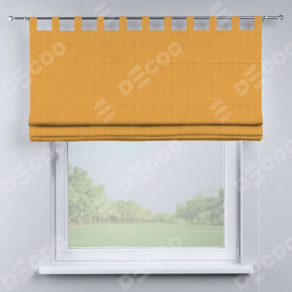Римская штора производителя «Cortin», используется для проёма, пошита из ткани блэкаут тиснение с блеском золотой, артикул ткани 34626. Изнаночная сторона материала черного цвета, что обеспечивает необходимую светонепроницаемость. Данная модель пошита на петлях, комплектуется на выбор круглым карнизом и подходит для монтажа на стену. Римская штора на петлях имеет простую систему регулировки высоты, отличительным преимуществом данной модели является простой способ монтажа. Достаточно повесить ее на трубу и штора готова!