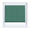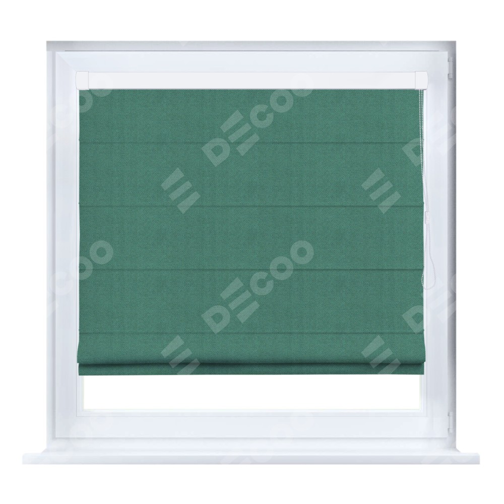 Римская штора кассетного типа, производителя «Cortin», устанавливается только на пластиковые окна и прилегает к стеклопакету, пошита из ткани из ткани блэкаут тиснение с блеском изумрудный, артикул 34628. Изнаночная сторона материала черного цвета, что обеспечивает необходимую светонепроницаемость.