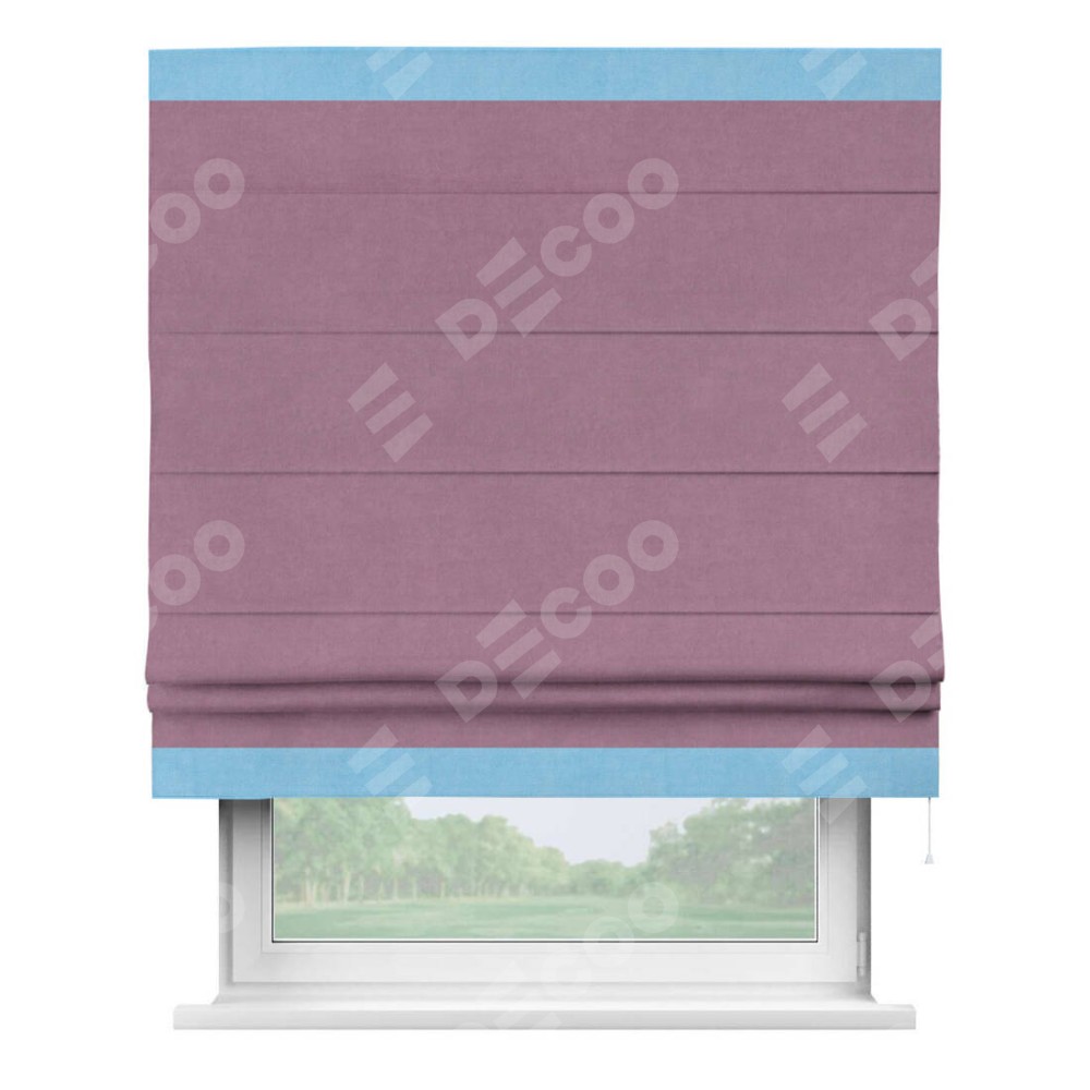 Римская штора производителя «Cortin», используется для проёма, пошита из ткани вельвет лиловый, артикул ткани 17752. Отделка шторы кантом «Горизонт», ткань для канта используется из вельвета разной расцветки на выбор. Имеет универсальный механизм и подходит для монтажа: на потолок, на стену и в нишу.