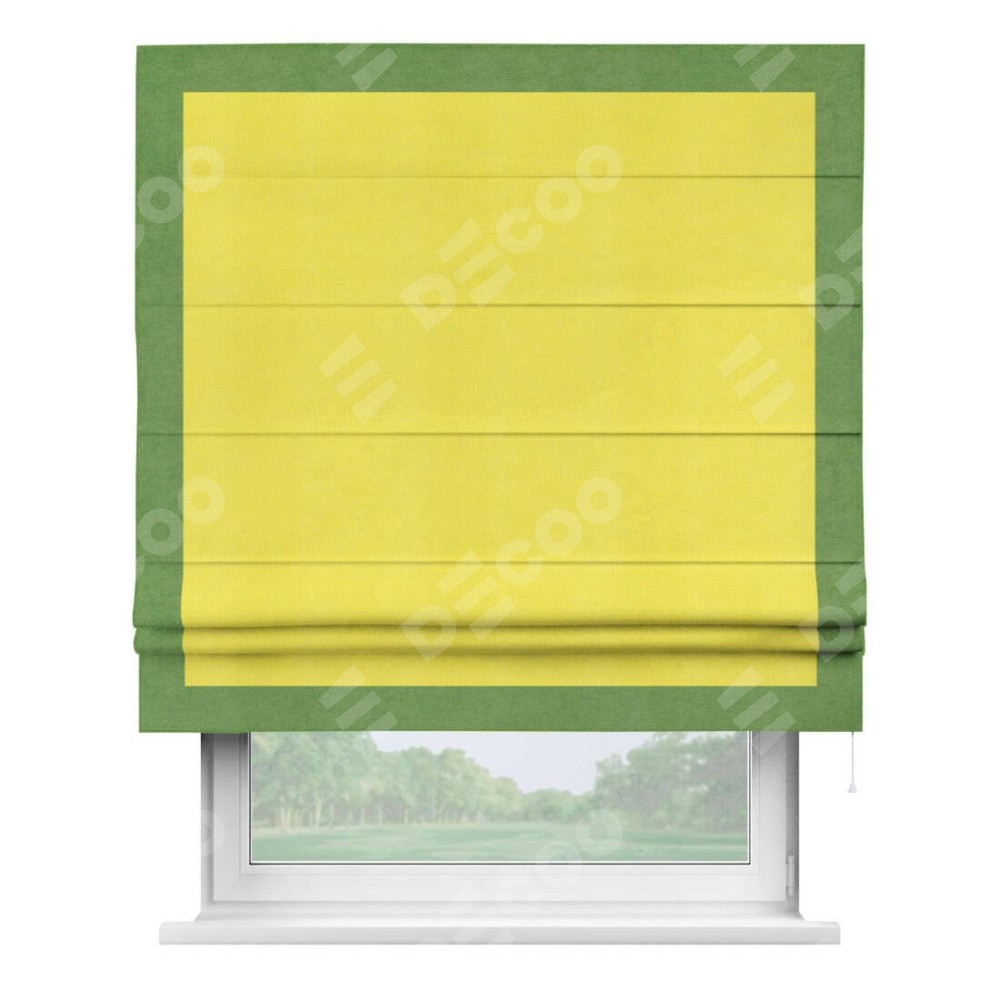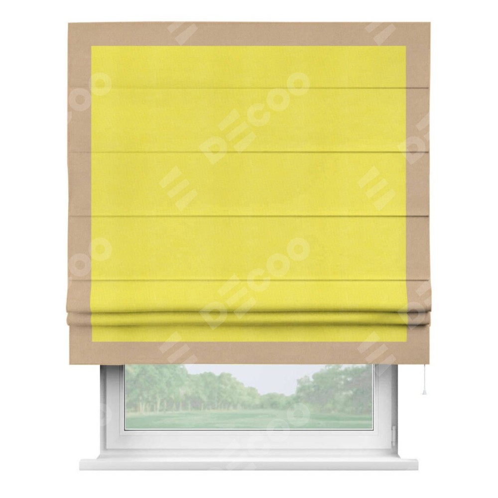 Римская штора производителя «Cortin», используется для проёма, пошита из ткани вельвет cветло-желтый, артикул ткани 30997. Отделка шторы кантом «Чесс», ткань для канта используется из вельвета разной расцветки на выбор. Имеет универсальный механизм и подходит для монтажа: на потолок, на стену и в нишу.