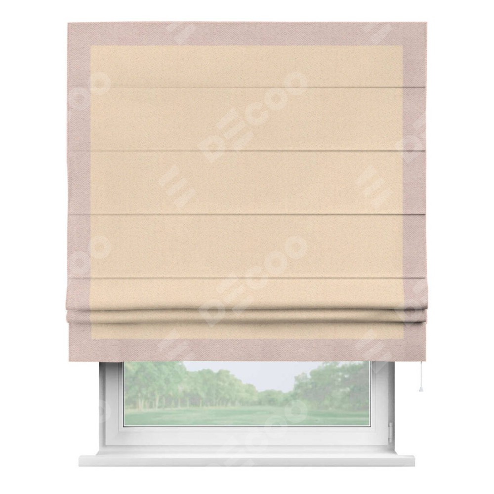 Римская штора производителя «Cortin», используется для проёма, пошита из ткани блэкаут с блеском бежевый, артикул 34627. Отделка шторы кантом «Чесс», ткань для канта используется из блэкаута с блеском разной расцветки на выбор. Изнаночная сторона материала черного цвета, что обеспечивает необходимую светонепроницаемость. Имеет универсальный механизм и подходит для монтажа: на потолок, на стену и в нишу.