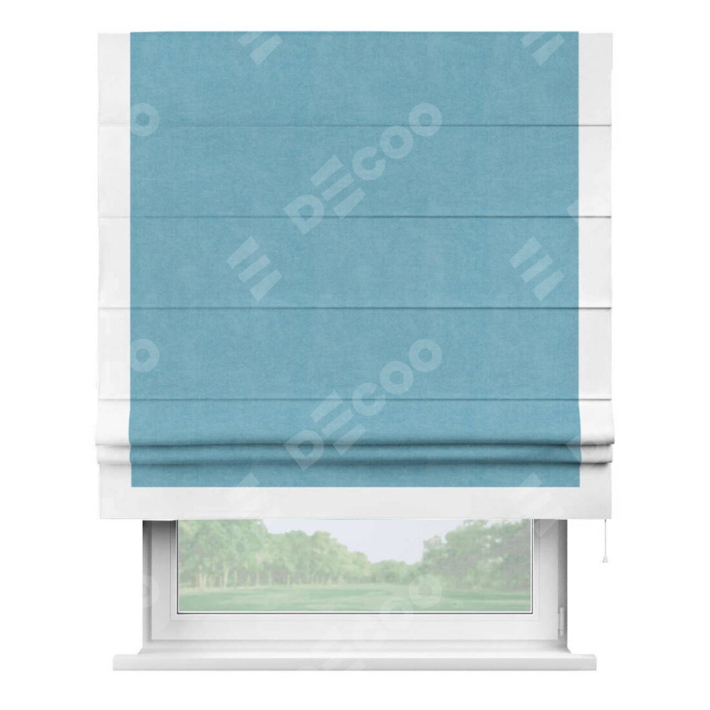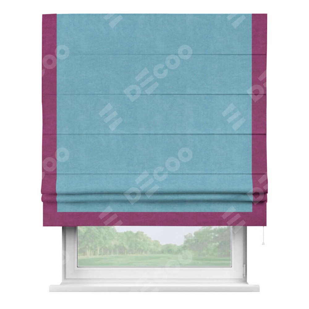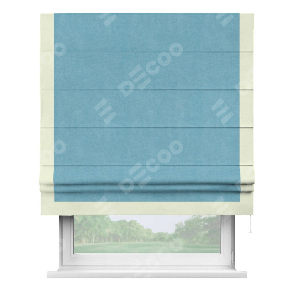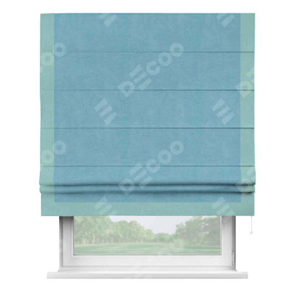 Римская штора производителя «Cortin», используется для проёма, пошита из ткани вельвет ментоловый, артикул ткани 10443. Отделка шторы кантом «Виктория», ткань для канта используется из вельвета разной расцветки на выбор. Имеет универсальный механизм и подходит для монтажа: на потолок, на стену и в нишу.