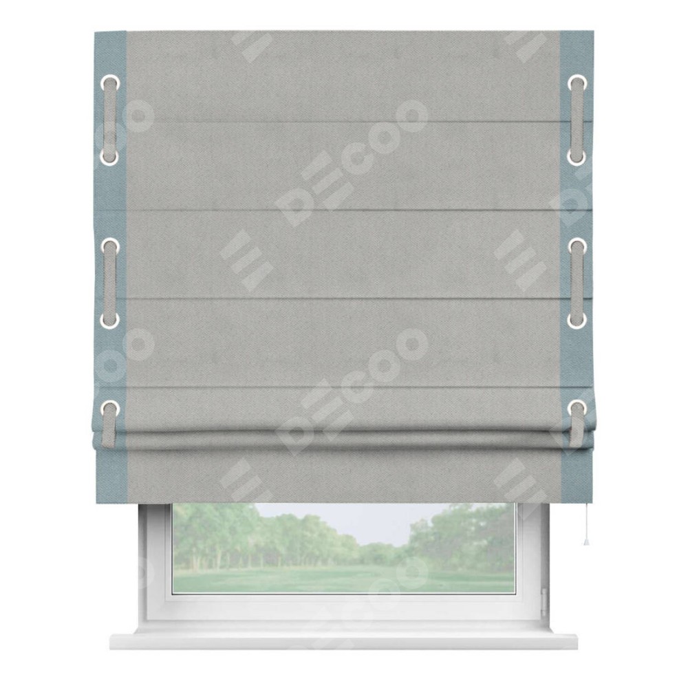 Римская штора производителя «Cortin», используется для проёма, пошита из ткани блэкаут с блеском тёмно-серый, артикул 34634. Отделка шторы кантом «Стрим Дуо» на кантах расположены люверсы с пояском, ткань для канта используется блэкаут с блеском разной расцветки на выбор. Ткань для пояска обычно используется из основной ткани шторы, а так же можно сделать из любой расцветки по желанию. Изнаночная сторона материала черного цвета, что обеспечивает необходимую светонепроницаемость. Имеет универсальный механизм и подходит для монтажа: на потолок, на стену и в нишу.