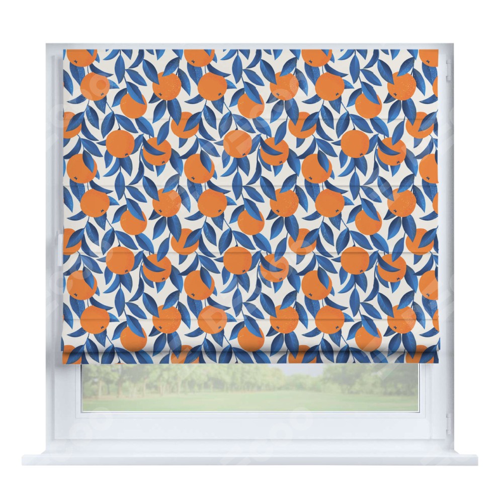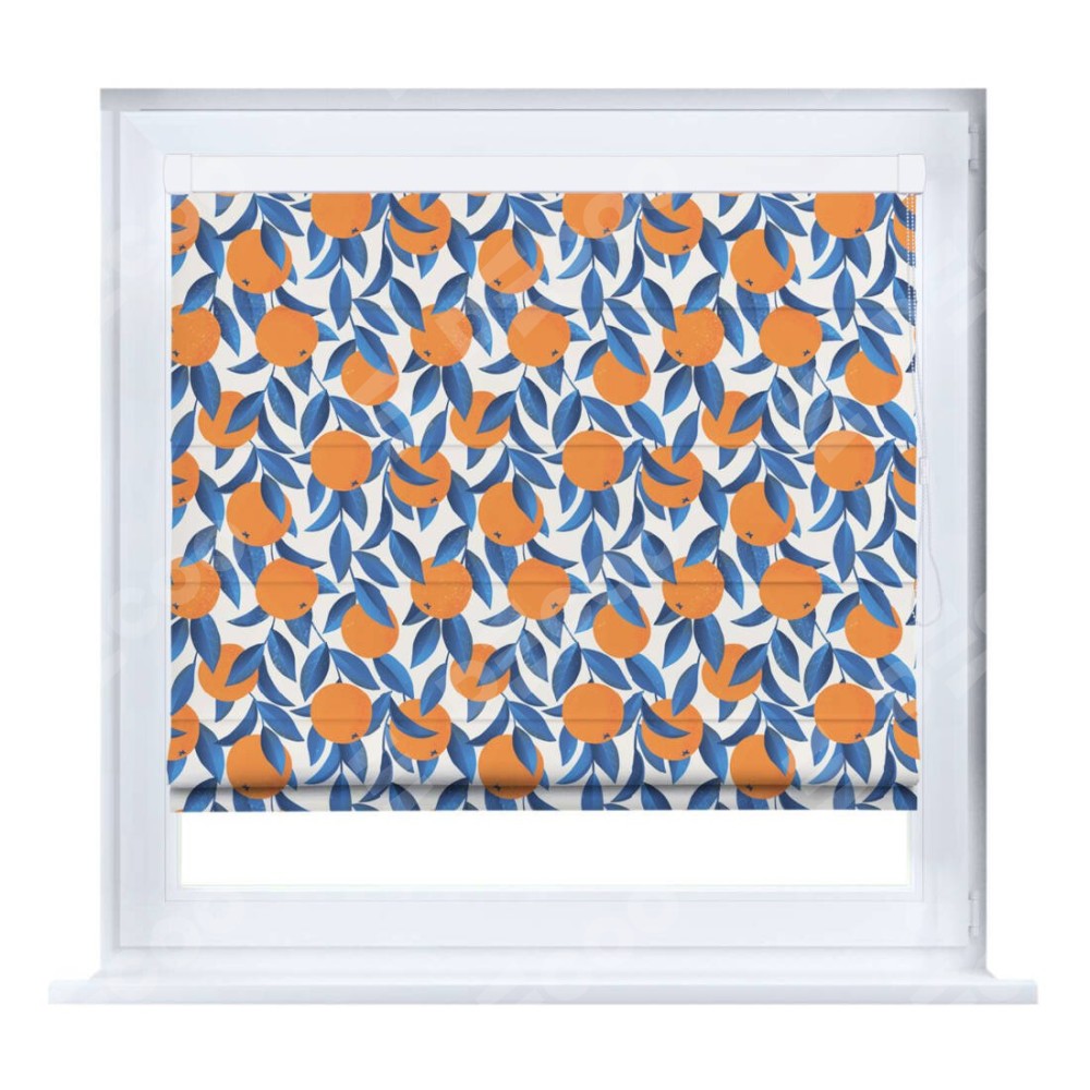 Римская штора производителя «Cortin», устанавливается на створку окна, пошита из ткани блэкаут с нанесением сублимационной печати «Апельсиновое настроение». Штора шьётся по индивидуальным размерам, для данного типа римской шторы возможная ширина от 35 до 150 см., высота до 250 см.