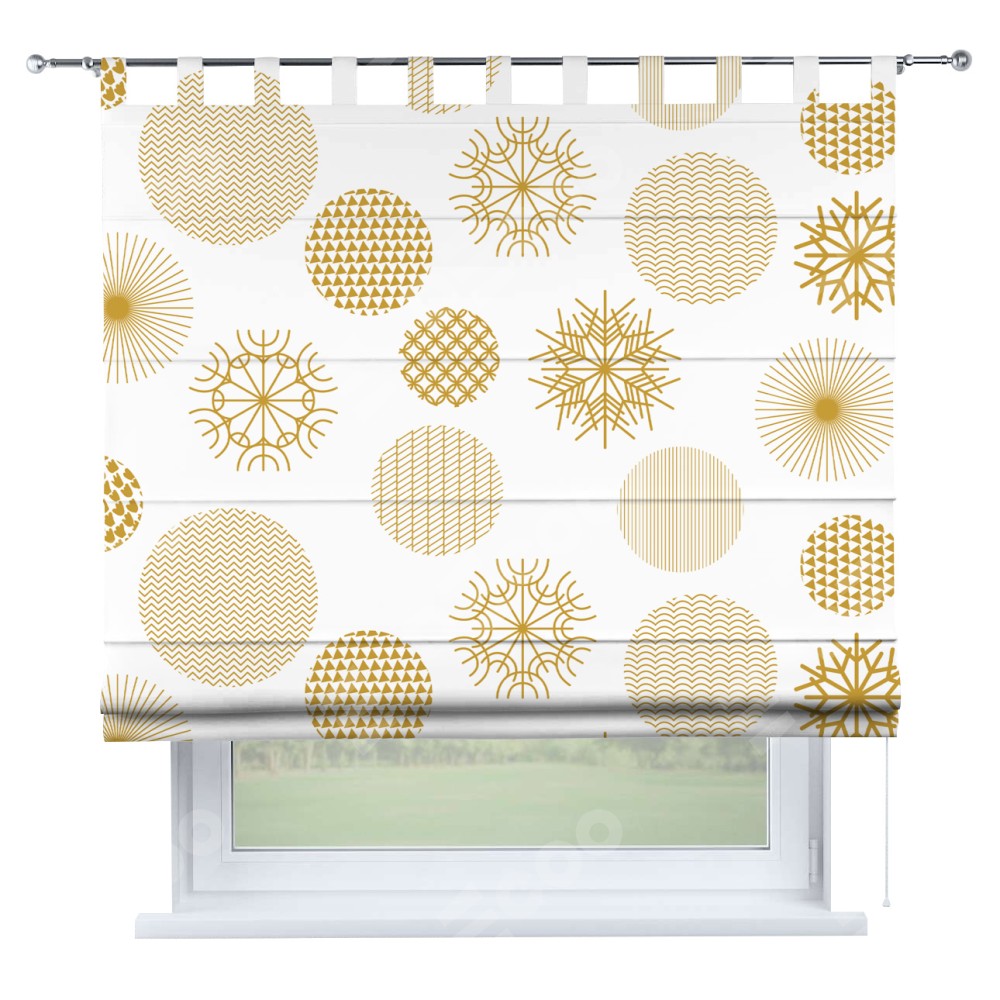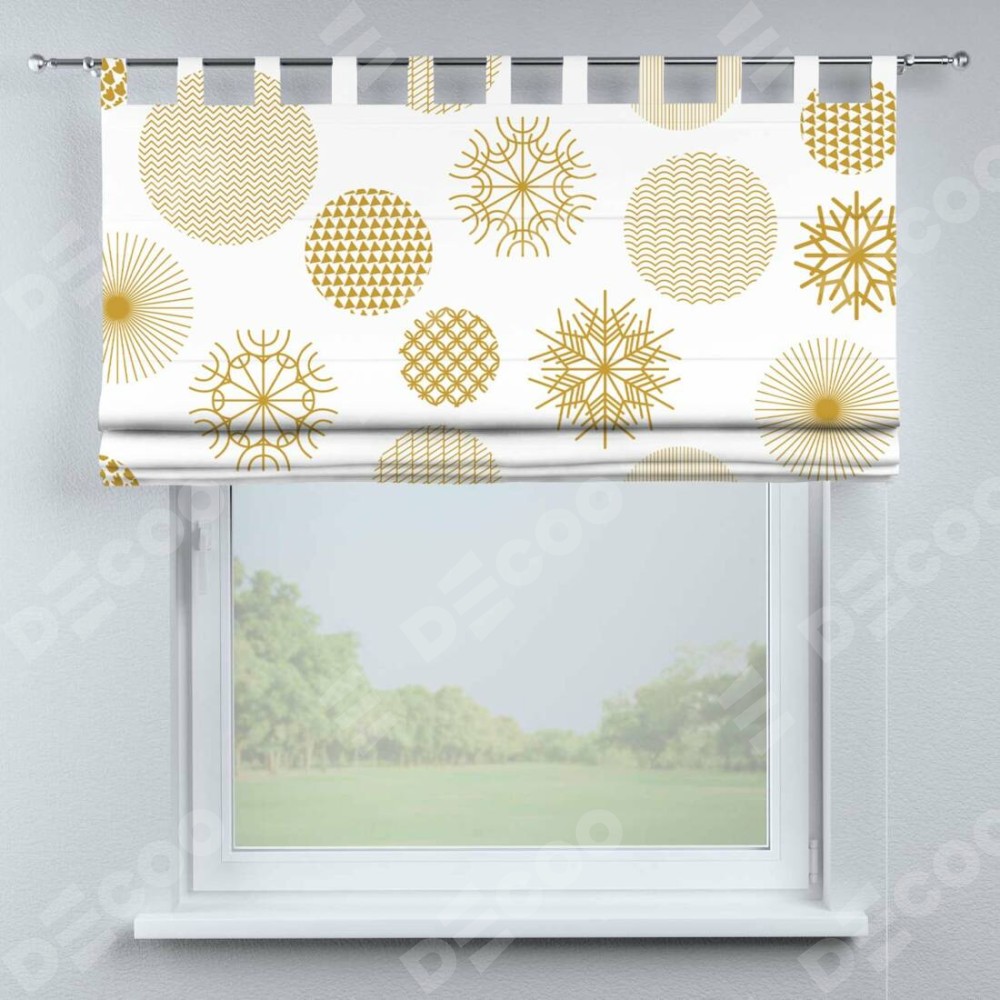 Римская штора производителя «Cortin», используется для проёма, пошита из ткани блэкаут с нанесением сублимационной печати «Золотые шары». Данная модель пошита на петлях, комплектуется на выбор круглым карнизом и подходит для монтажа на стену. Римская штора на петлях имеет простую систему регулировки высоты, отличительным преимуществом данной модели является простой способ монтажа. Достаточно повесить ее на трубу и штора готова!