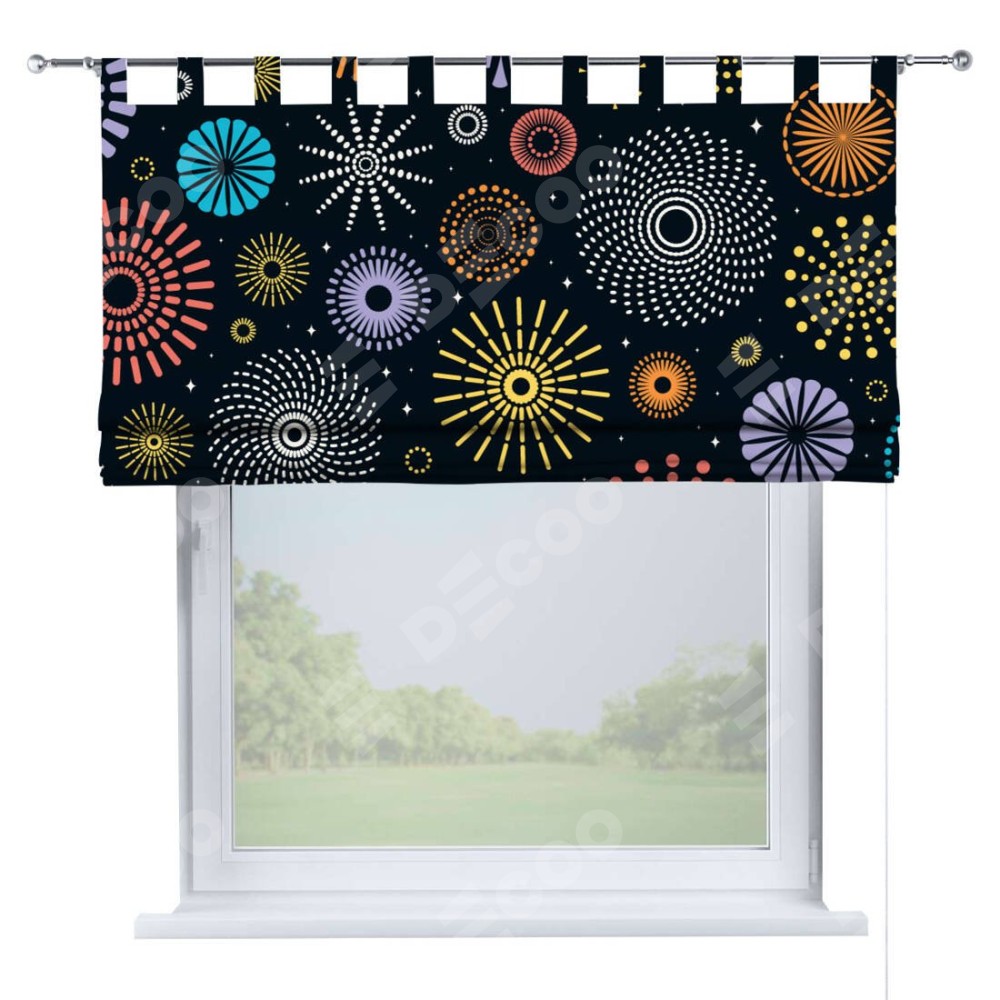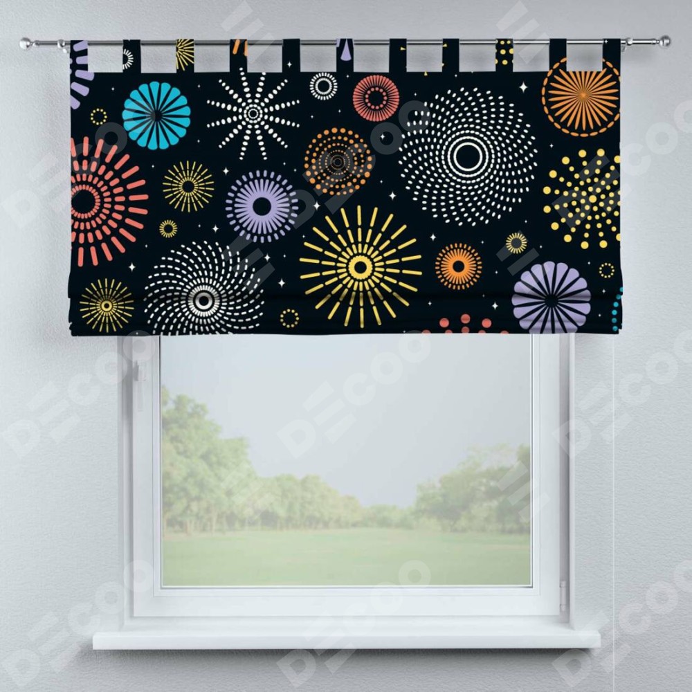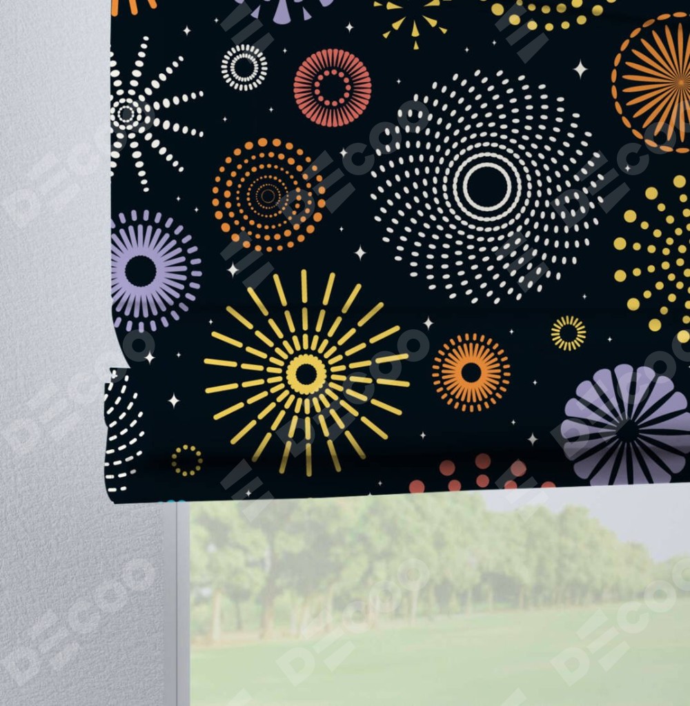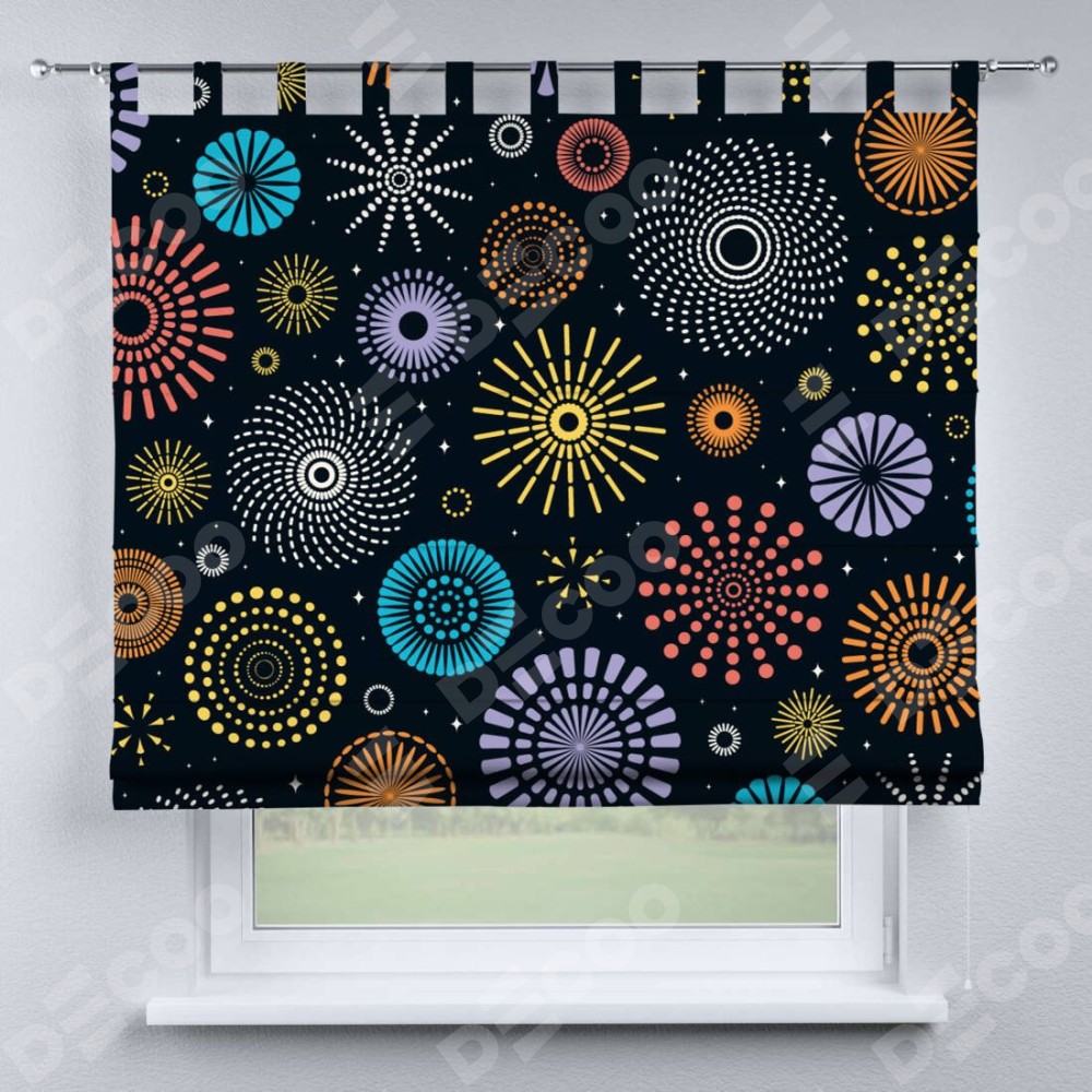 Римская штора производителя «Cortin», используется для проёма, пошита из ткани блэкаут с нанесением сублимационной печати «Праздничный фейерверк». Данная модель пошита на петлях, комплектуется на выбор круглым карнизом и подходит для монтажа на стену. Римская штора на петлях имеет простую систему регулировки высоты, отличительным преимуществом данной модели является простой способ монтажа. Достаточно повесить ее на трубу и штора готова!