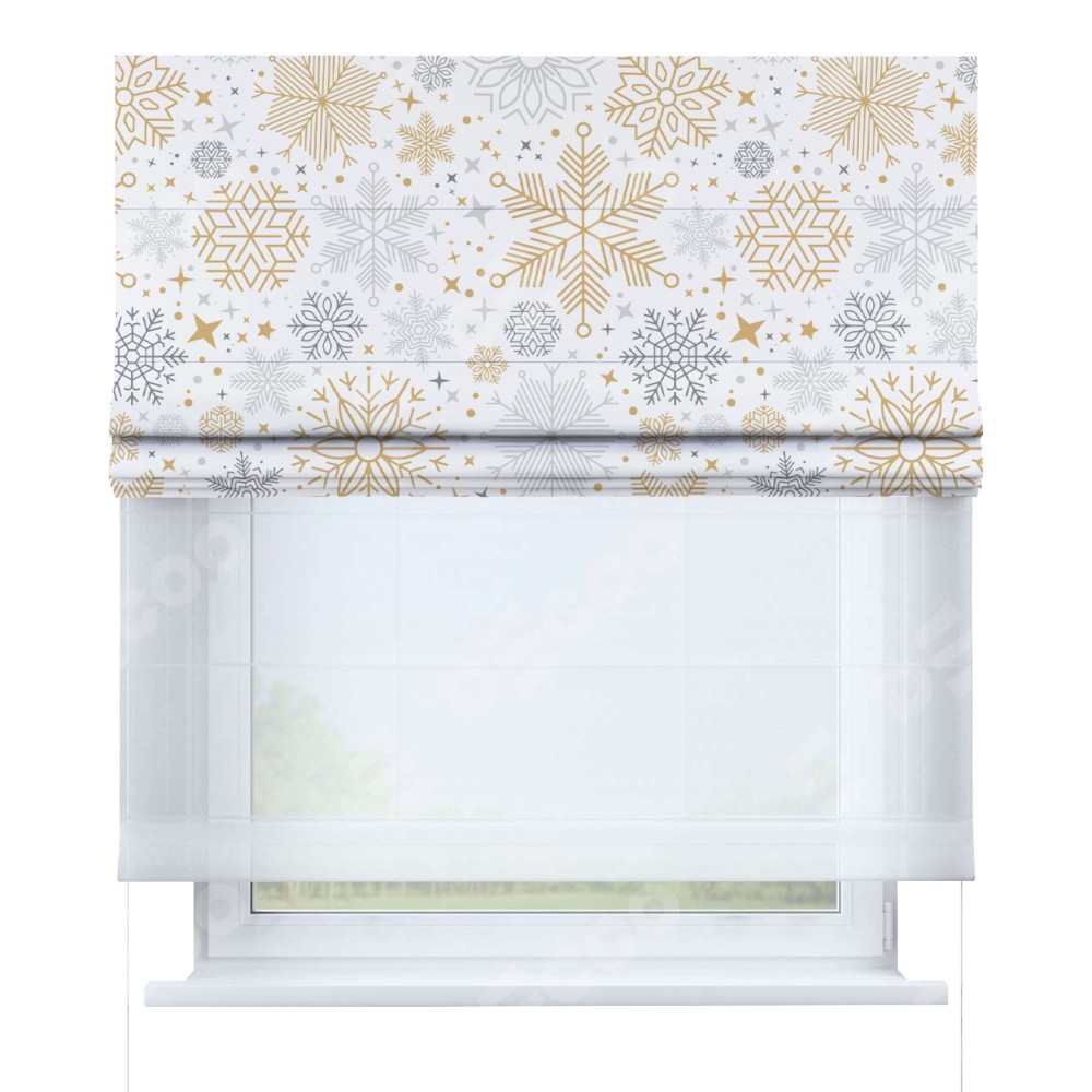 Римская штора день-ночь производителя «Cortin», используется для проёма, пошита из двух полотен, с лицевой блэкаут с нанесением сублимационной печати «Снежное очарование», вторая ткань тюль (по стандарту комплектуется тюль белого цвета артикул V-01). Имеет универсальный механизм и подходит для монтажа: на потолок, на стену и в нишу.