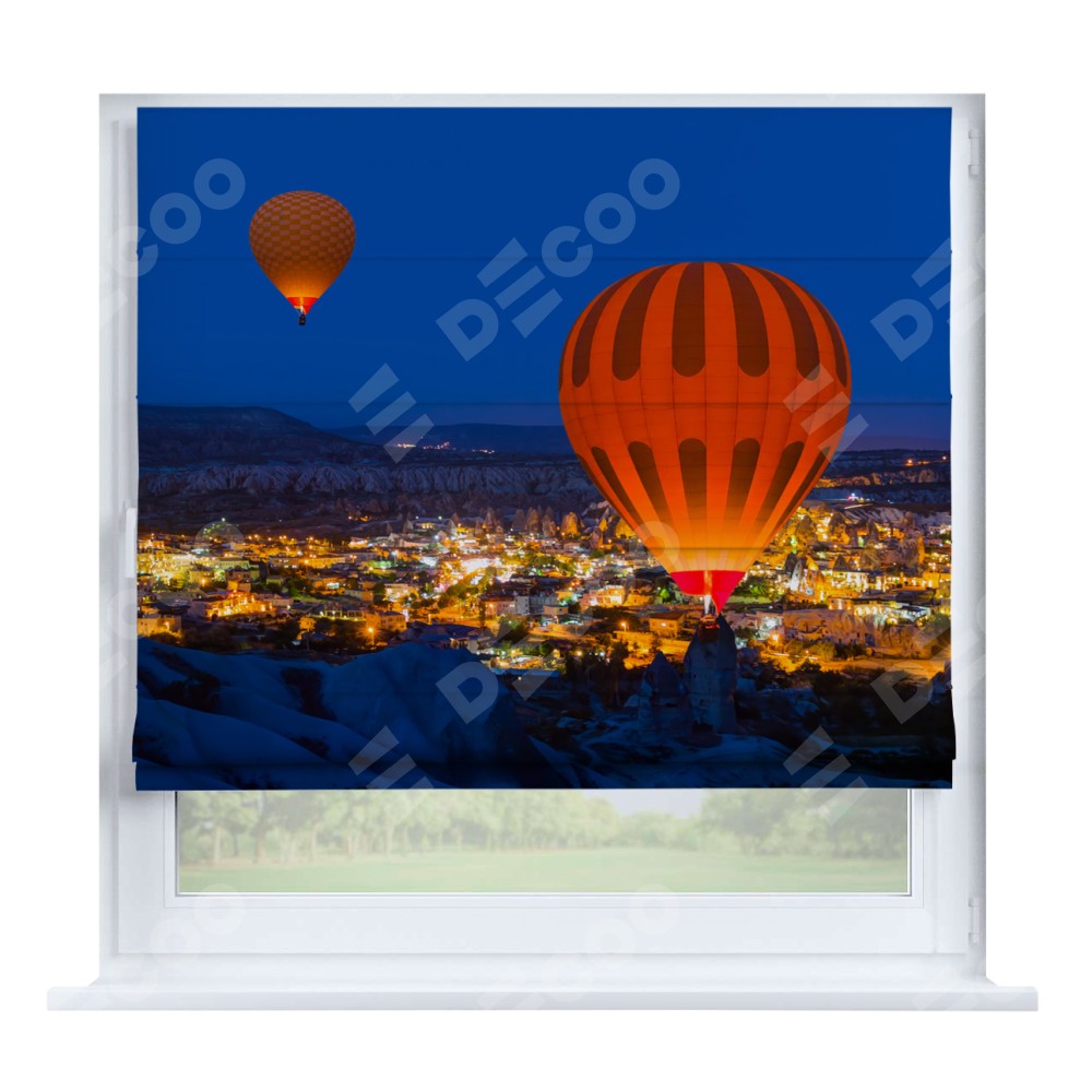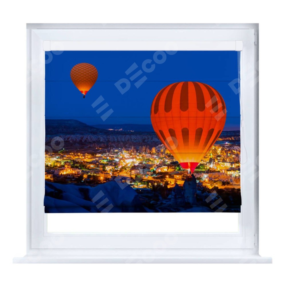 Римская штора производителя «Cortin», устанавливается на створку окна, пошита из ткани блэкаут с нанесением сублимационной печати «Воздушные шары в небе». Штора шьётся по индивидуальным размерам, для данного типа римской шторы возможная ширина от 35 до 150 см., высота до 250 см.