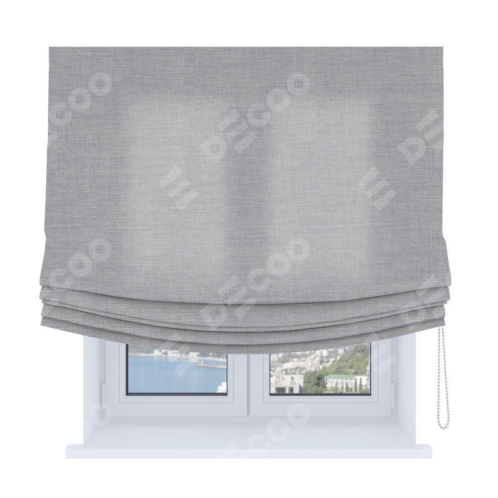Римская штора Soft производителя «Cortin», используется для проёма, пошита из ткани лён серый, артикул ткани 7440. Имеет универсальный механизм и подходит для монтажа: на потолок, на стену и в нишу. В отличие от стандартных римских штор, римская штора Soft не имеет горизонтальных вставок и нижнего отвеса. Это позволяет ткани произвольно драпироваться в свободные мягкие складки.