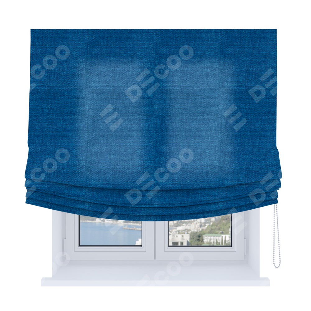 Римская штора Soft производителя «Cortin», используется для проёма, пошита из ткани лён синий, артикул ткани 63742. Имеет универсальный механизм и подходит для монтажа: на потолок, на стену и в нишу. В отличие от стандартных римских штор, римская штора Soft не имеет горизонтальных вставок и нижнего отвеса. Это позволяет ткани произвольно драпироваться в свободные мягкие складки.