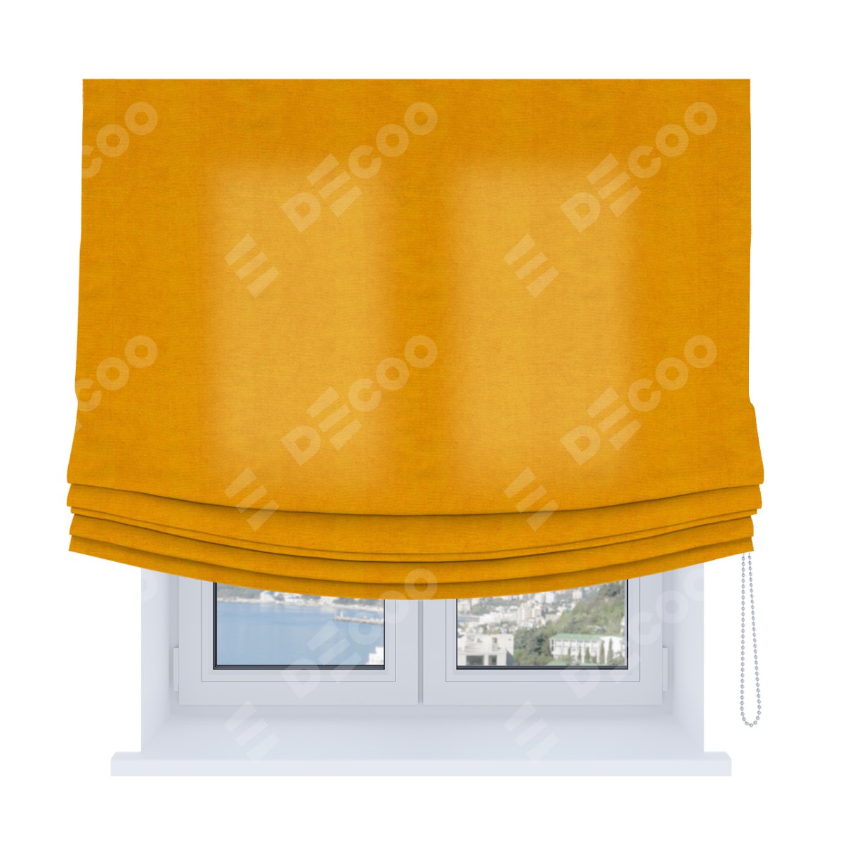 Римская штора Soft производителя «Cortin», используется для проёма, пошита из ткани вельвет желтый, артикул ткани 85547. Имеет универсальный механизм и подходит для монтажа: на потолок, на стену и в нишу. В отличие от стандартных римских штор, римская штора Soft не имеет горизонтальных вставок и нижнего отвеса. Это позволяет ткани произвольно драпироваться в свободные мягкие складки.