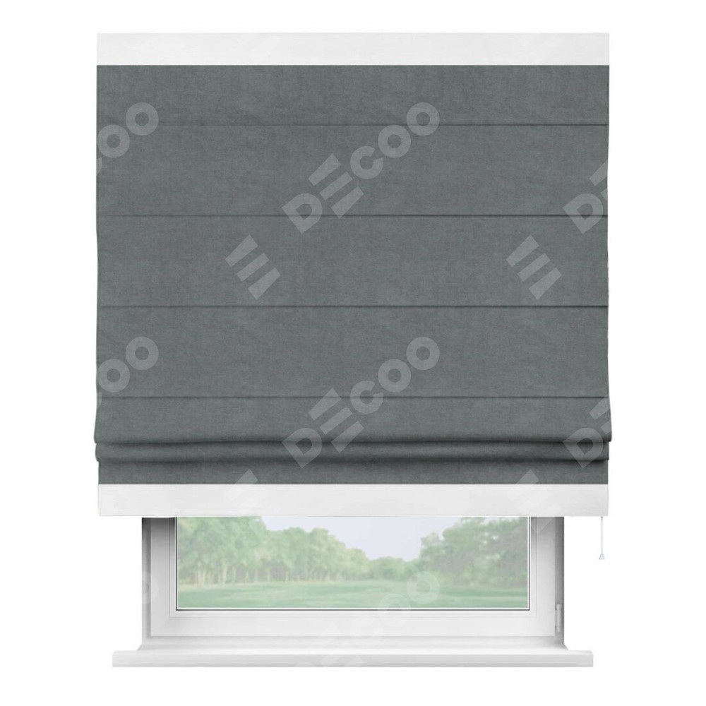 Римская штора производителя «Cortin», используется для проёма, пошита из ткани вельвет серый, артикул ткани 85542. Отделка шторы кантом «Горизонт», ткань для канта используется из вельвета разной расцветки на выбор. Имеет универсальный механизм и подходит для монтажа: на потолок, на стену и в нишу.