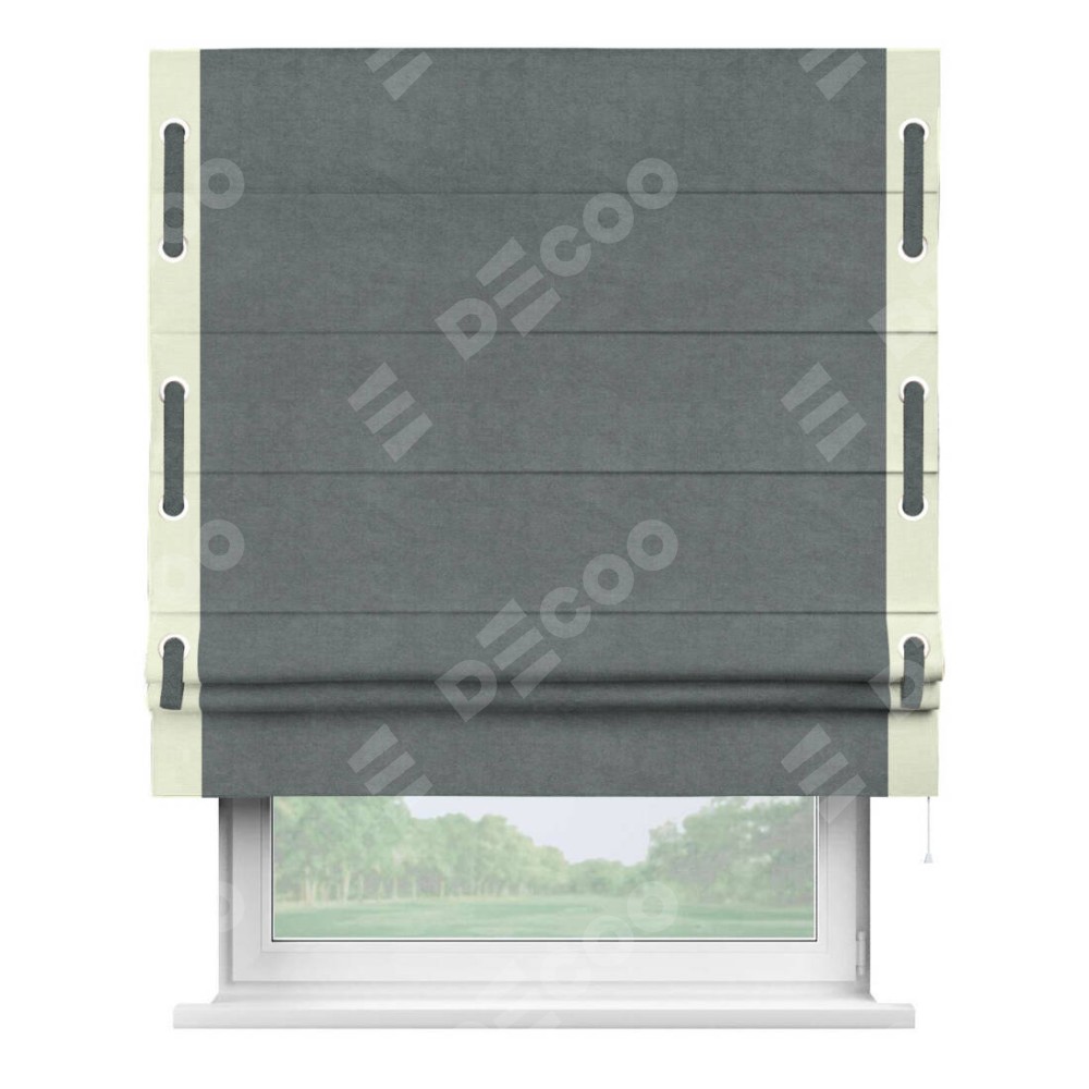 Римская штора производителя «Cortin», используется для проёма, пошита из ткани вельвет серый, артикул ткани 85542. Отделка шторы кантом «Стрим Дуо» на кантах расположены люверсы с пояском, ткань для канта используется из вельвета разной расцветки на выбор. Ткань для пояска обычно используется из основной ткани шторы, а так же можно сделать из любой расцветки по желанию. Имеет универсальный механизм и подходит для монтажа: на потолок, на стену и в нишу.