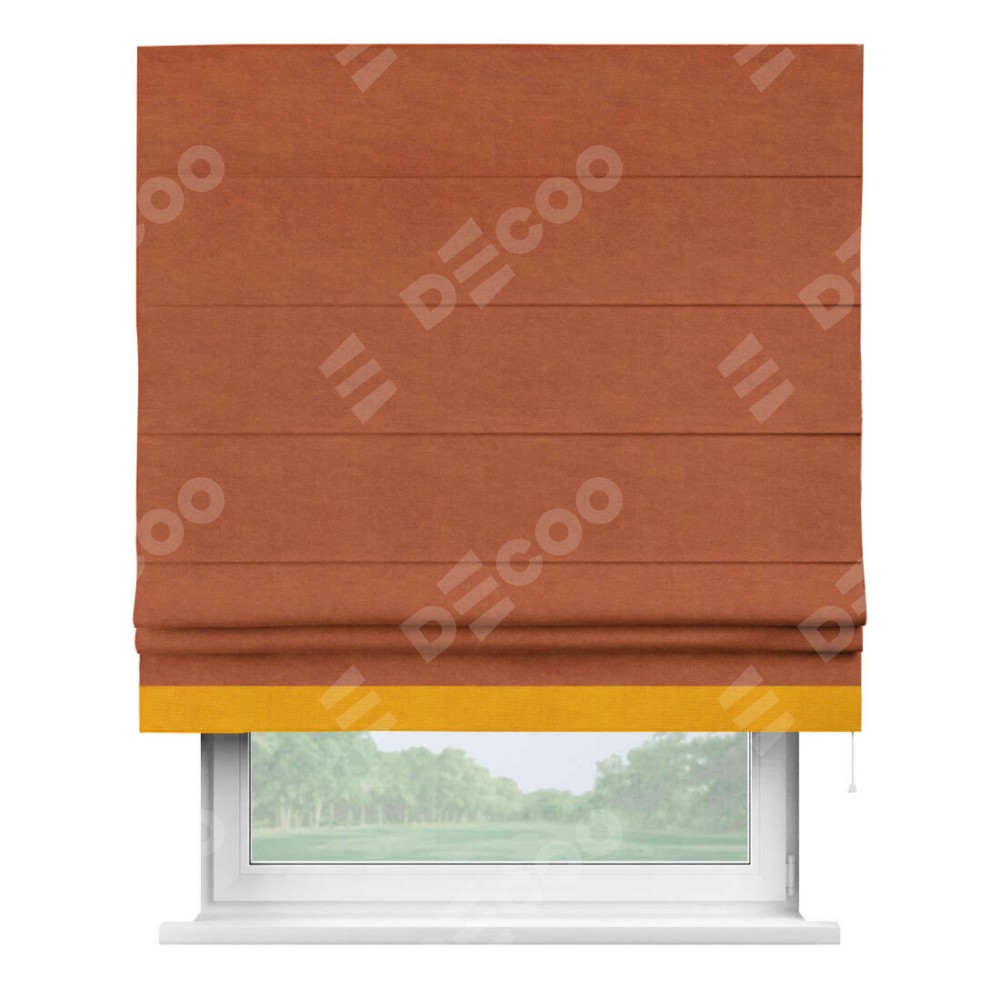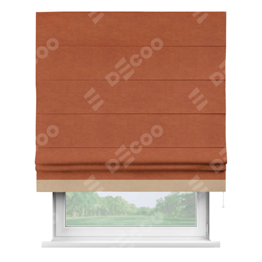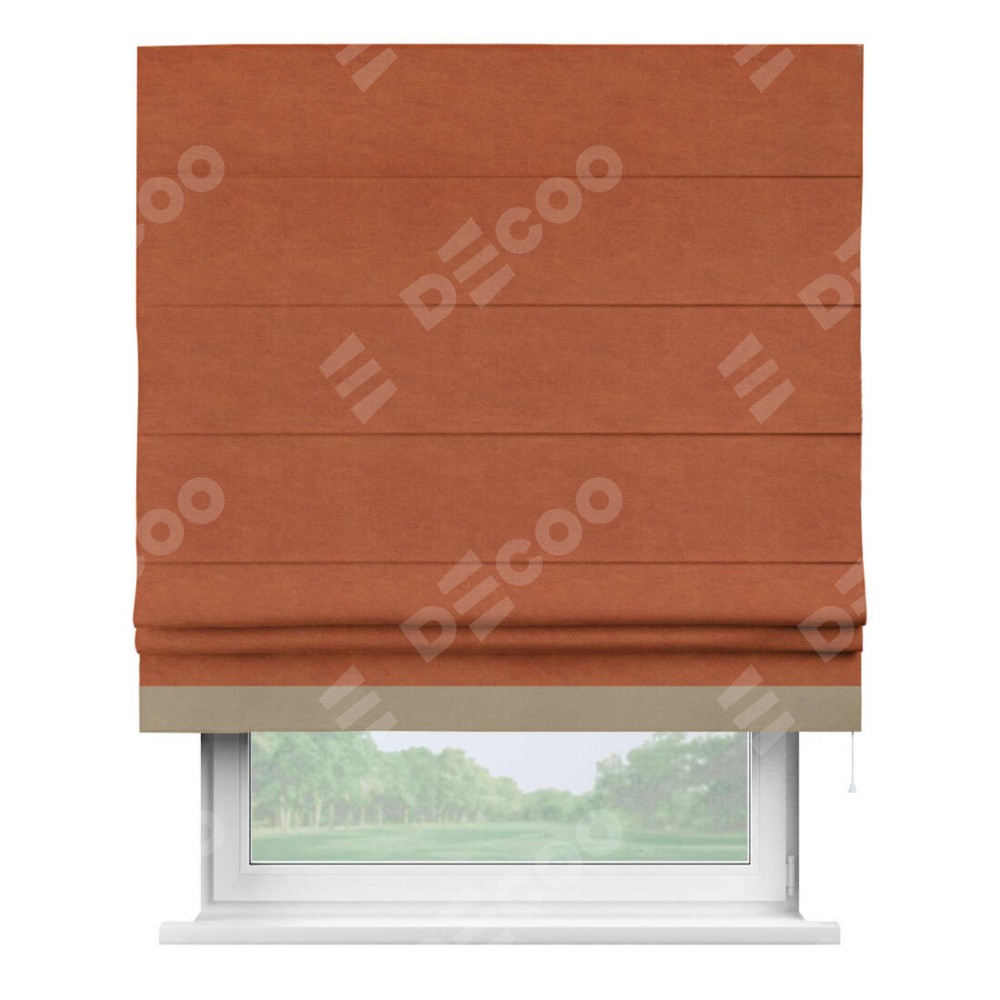 Римская штора производителя «Cortin», используется для проёма, пошита из ткани вельвет терракотовый, артикул ткани 85548. Отделка шторы кантом «Джестер», ткань для канта используется из вельвета разной расцветки на выбор. Имеет универсальный механизм и подходит для монтажа: на потолок, на стену и в нишу.