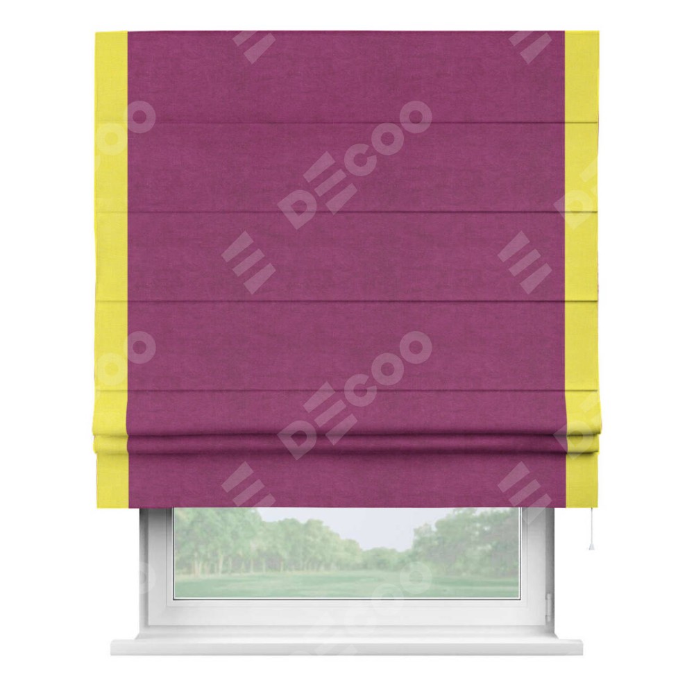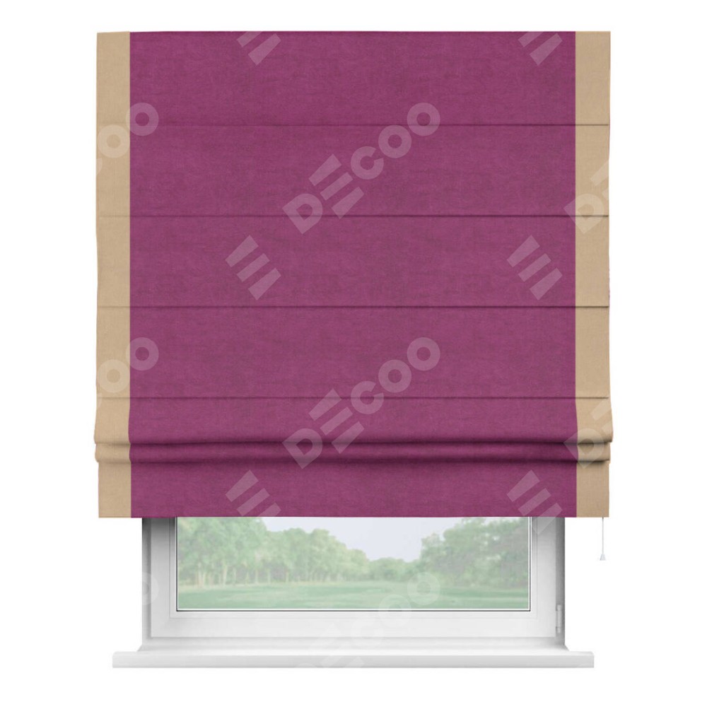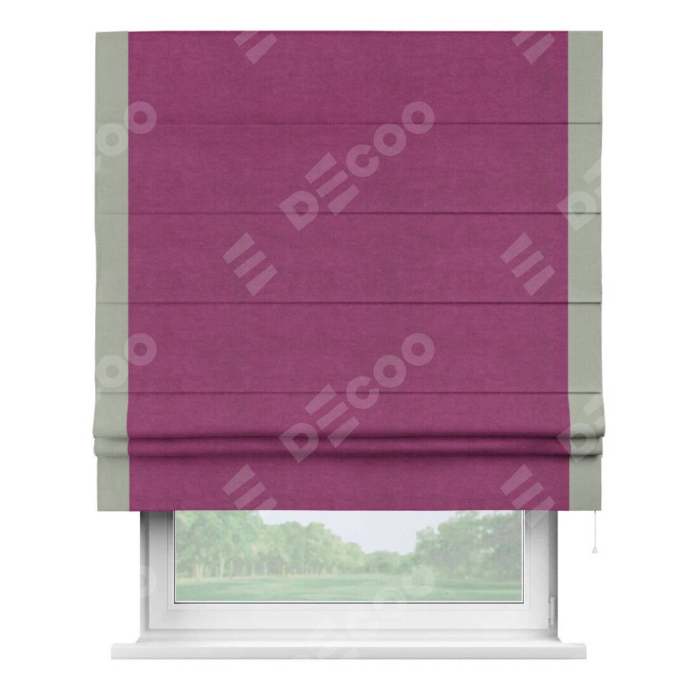 Римская штора производителя «Cortin», используется для проёма, пошита из ткани вельвет фиолетовый, артикул ткани 85552. Отделка шторы кантом «Стрим Дуо», ткань для канта используется из вельвета разной расцветки на выбор. Имеет универсальный механизм и подходит для монтажа: на потолок, на стену и в нишу.