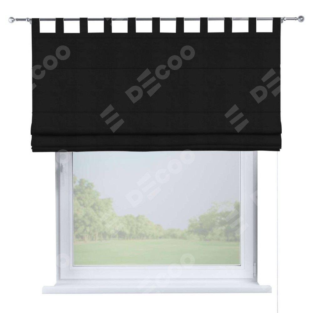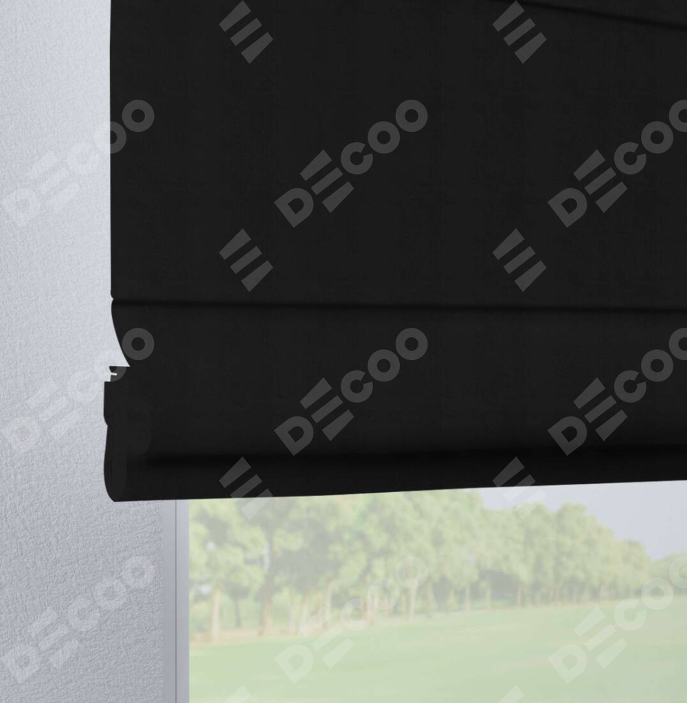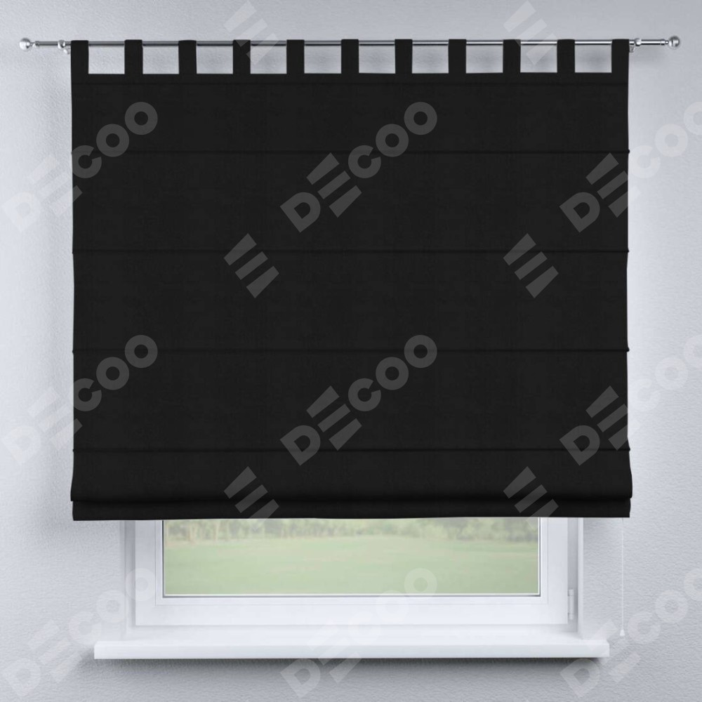 Римская штора производителя «Cortin», используется для проёма, пошита из ткани блэкаут однотонный черный, артикул ткани 79904. Данная модель пошита на петлях, комплектуется на выбор круглым карнизом и подходит для монтажа на стену. Римская штора на петлях имеет простую систему регулировки высоты, отличительным преимуществом данной модели является простой способ монтажа. Достаточно повесить ее на трубу и штора готова!