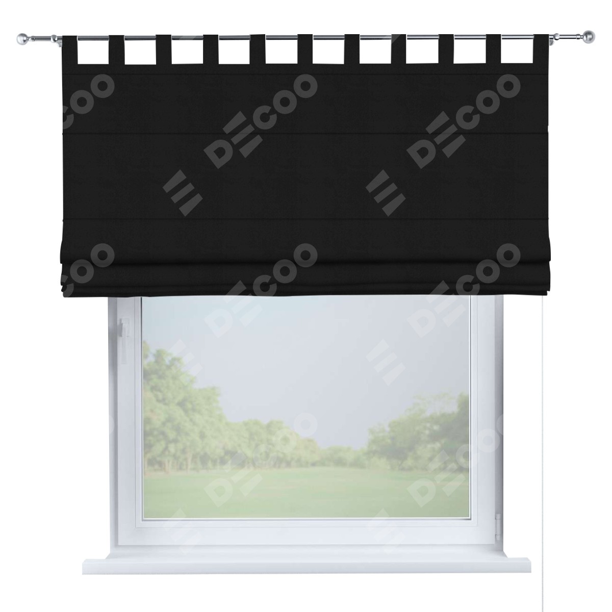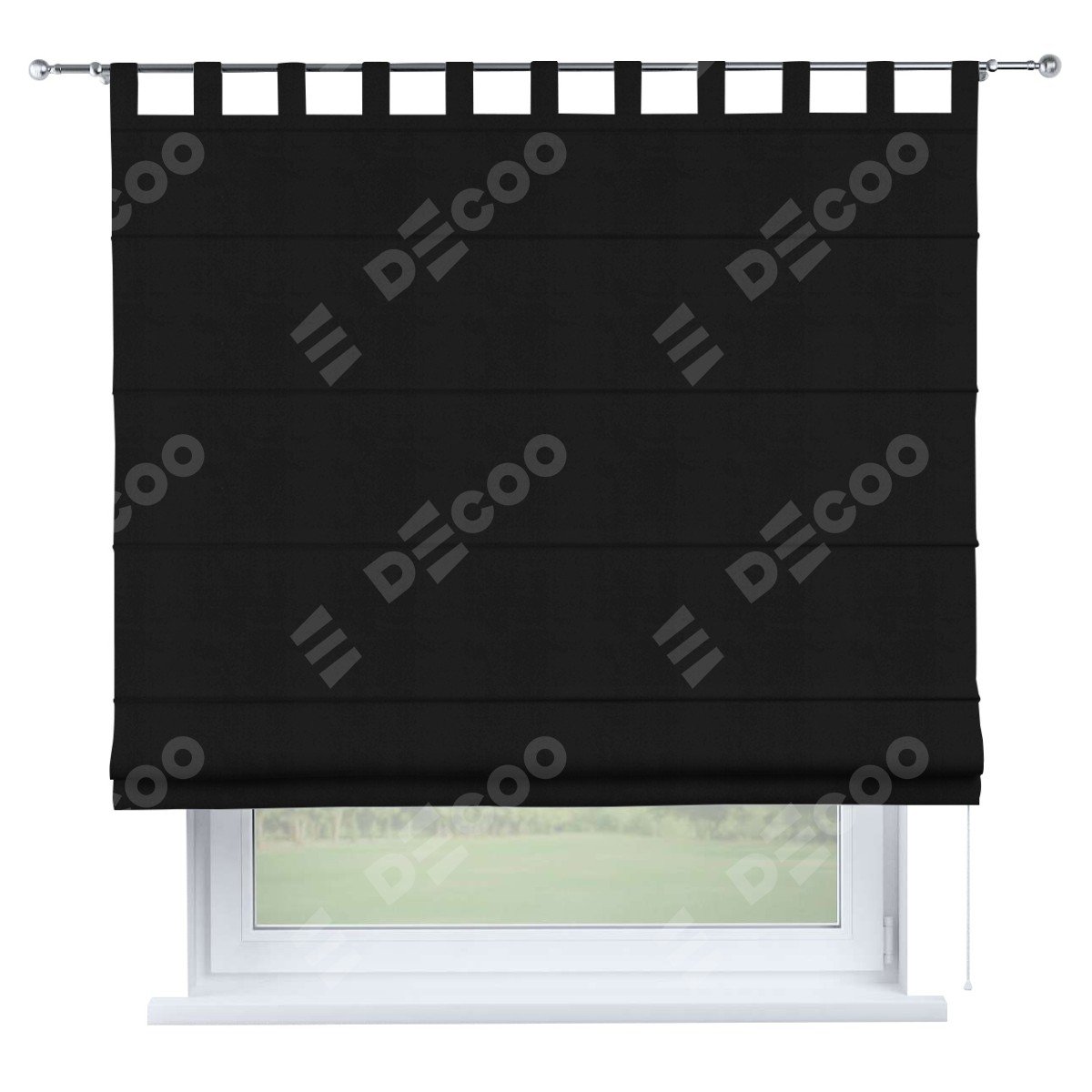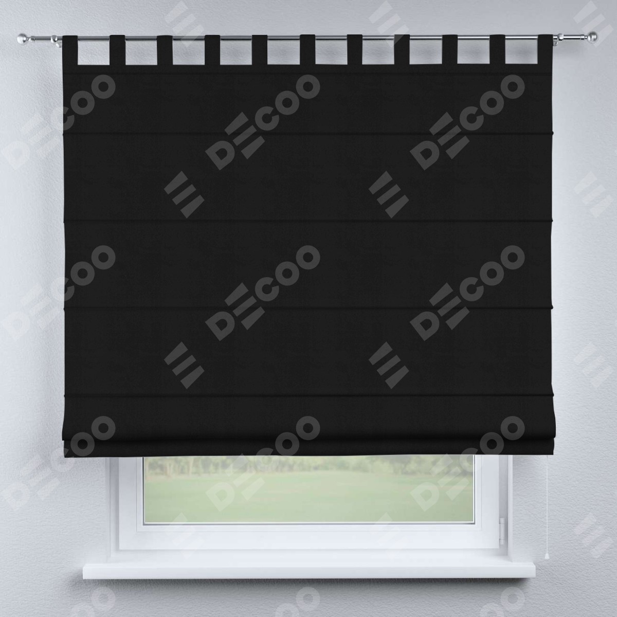 Римская штора производителя «Cortin», используется для проёма, пошита из ткани блэкаут однотонный черный, артикул ткани 79904. Данная модель пошита на петлях, комплектуется на выбор круглым карнизом и подходит для монтажа на стену. Римская штора на петлях имеет простую систему регулировки высоты, отличительным преимуществом данной модели является простой способ монтажа. Достаточно повесить ее на трубу и штора готова!