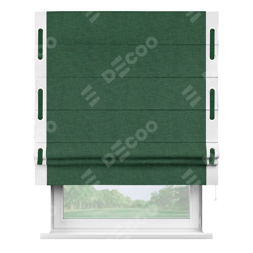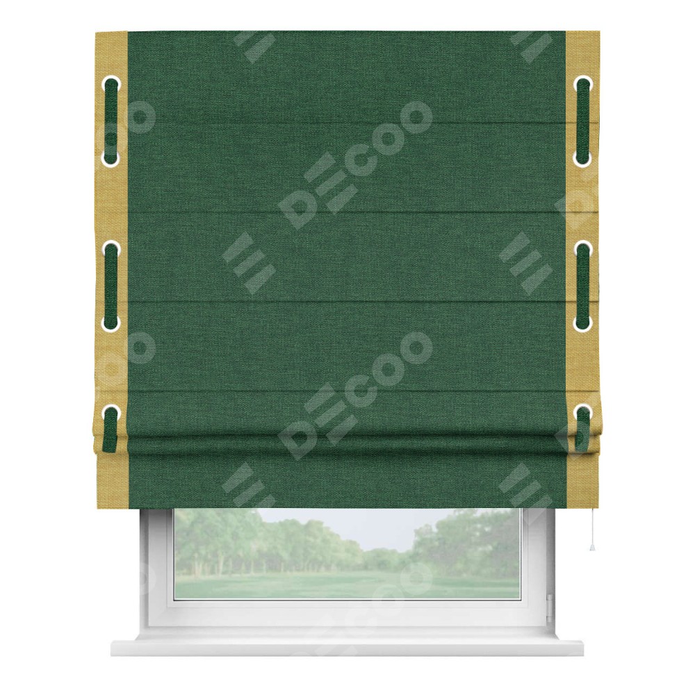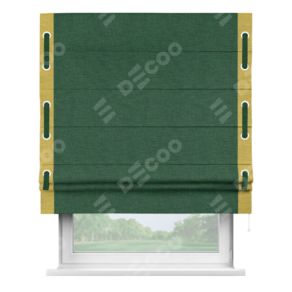 Римская штора производителя «Cortin», используется для проёма, пошита из ткани лён серо-зеленый, артикул 63740. Отделка шторы кантом «Стрим Дуо» на кантах расположены люверсы с пояском, ткань для канта используется из льна разной расцветки на выбор. Ткань для пояска обычно используется из основной ткани шторы, а так же можно сделать из любой расцветки по желанию. Имеет универсальный механизм и подходит для монтажа: на потолок, на стену и в нишу.