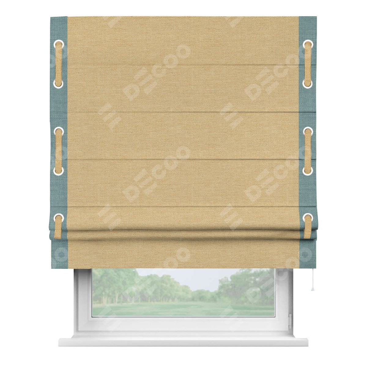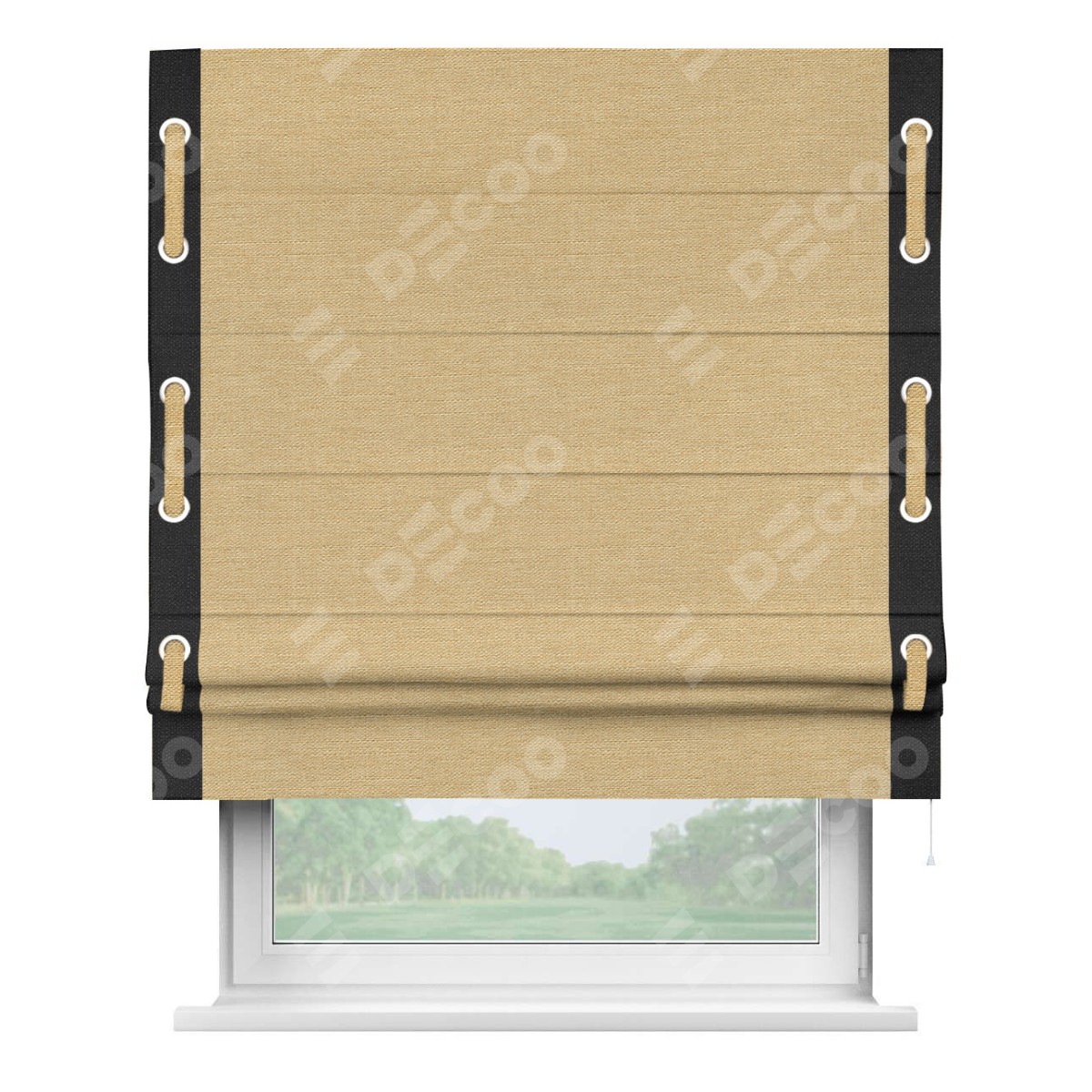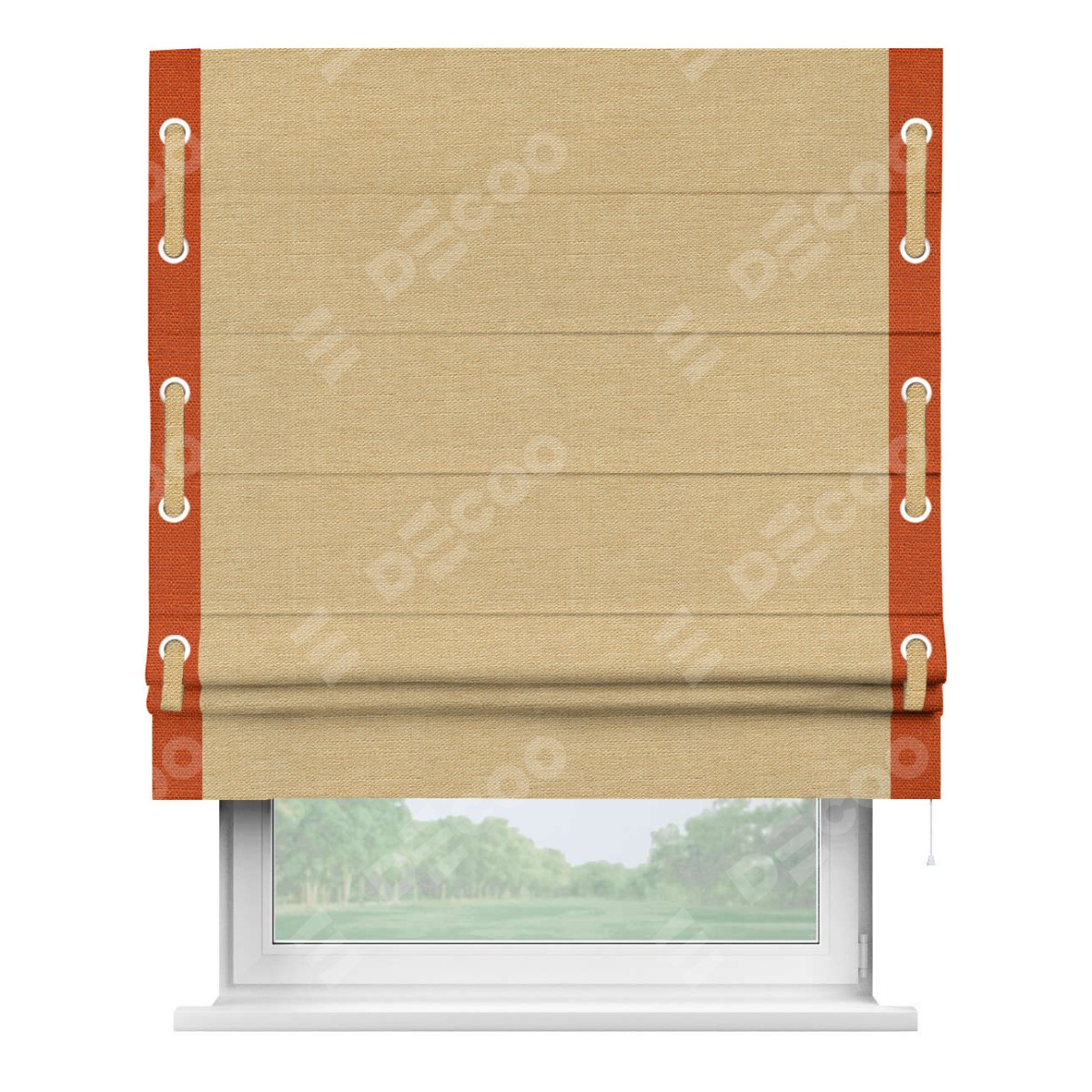 Римская штора производителя «Cortin», используется для проёма, пошита из ткани лён темно-бежевый, артикул 53433. Отделка шторы кантом «Стрим Дуо» на кантах расположены люверсы с пояском, ткань для канта используется из льна разной расцветки на выбор. Ткань для пояска обычно используется из основной ткани шторы, а так же можно сделать из любой расцветки по желанию. Имеет универсальный механизм и подходит для монтажа: на потолок, на стену и в нишу.