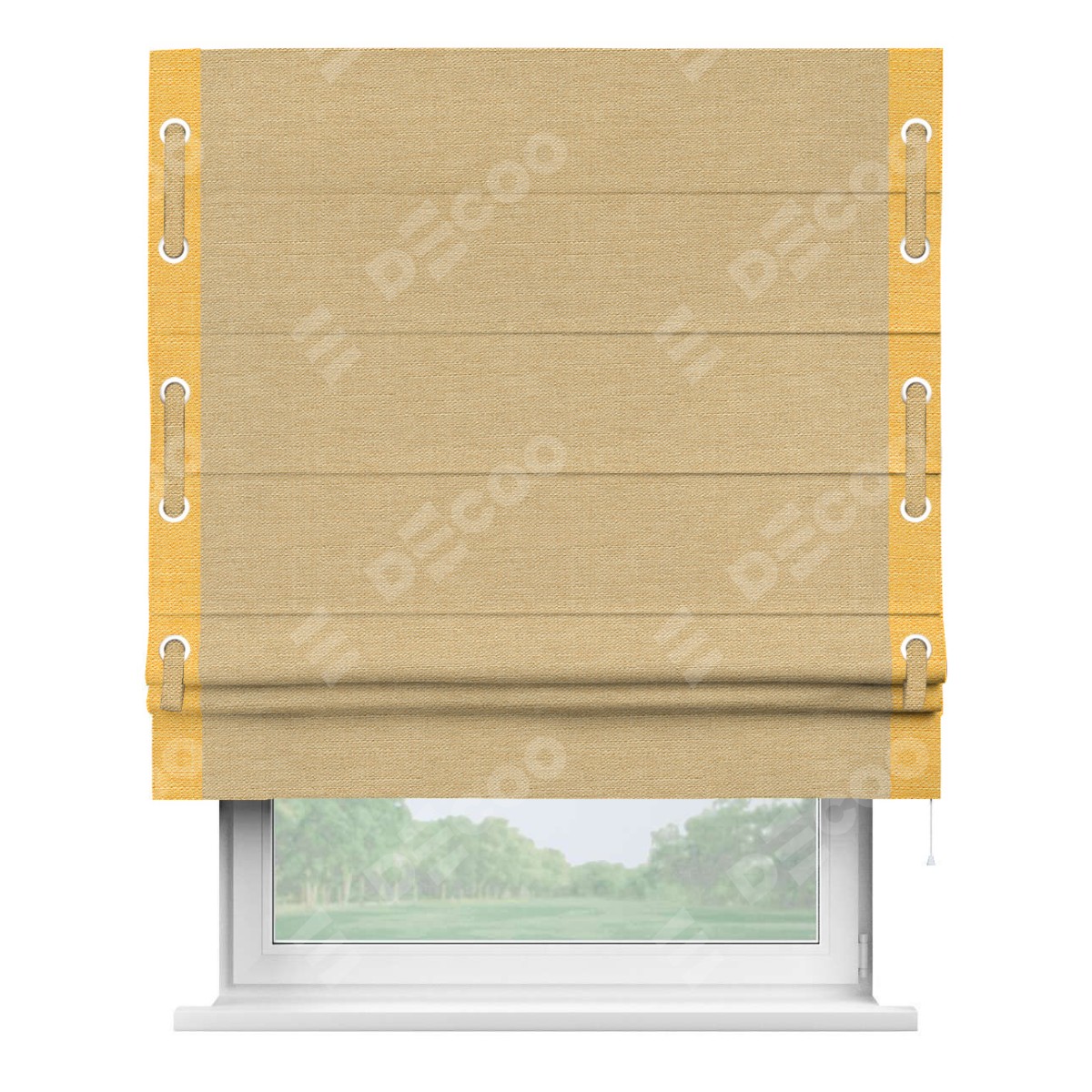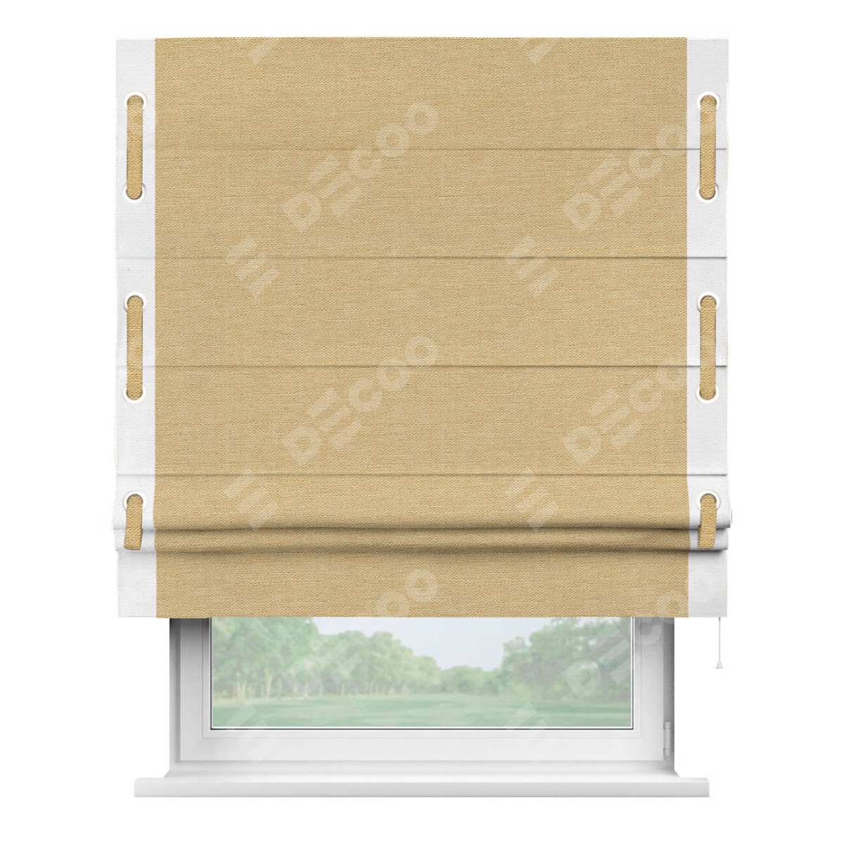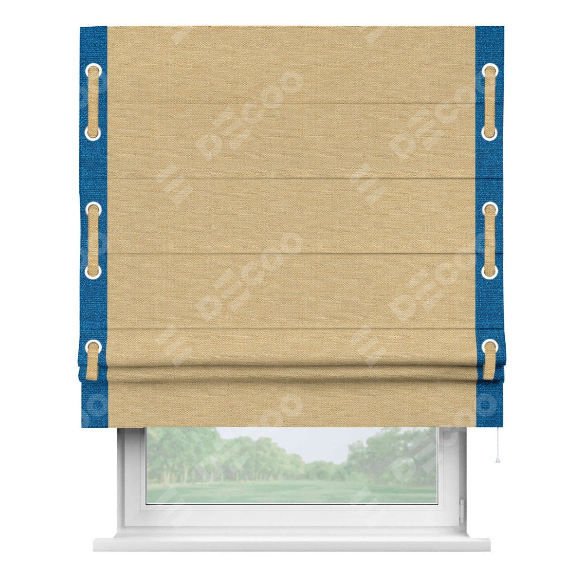 Римская штора производителя «Cortin», используется для проёма, пошита из ткани лён темно-бежевый, артикул 53433. Отделка шторы кантом «Стрим Дуо» на кантах расположены люверсы с пояском, ткань для канта используется из льна разной расцветки на выбор. Ткань для пояска обычно используется из основной ткани шторы, а так же можно сделать из любой расцветки по желанию. Имеет универсальный механизм и подходит для монтажа: на потолок, на стену и в нишу.