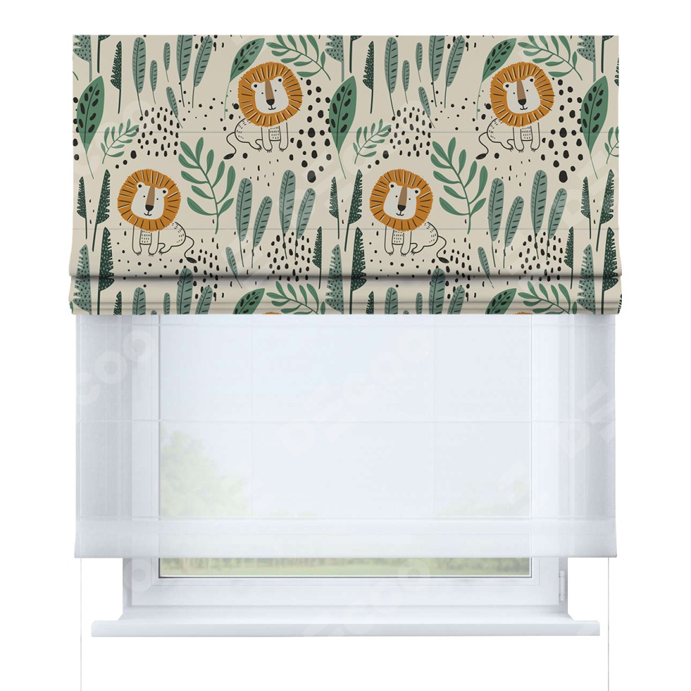 Римская штора день-ночь производителя «Cortin», используется для проёма, пошита из двух полотен, с лицевой блэкаут с нанесением сублимационной печати «Лев из джунглей», вторая ткань тюль (по стандарту комплектуется тюль белого цвета артикул V-01). Имеет универсальный механизм и подходит для монтажа: на потолок, на стену и в нишу.
