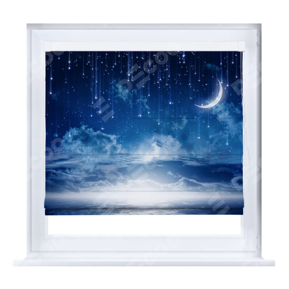Римская штора производителя «Cortin», устанавливается на створку окна, пошита из ткани блэкаут с нанесением сублимационной печати «Ночное небо». Штора шьётся по индивидуальным размерам, для данного типа римской шторы возможная ширина от 35 до 150 см., высота до 250 см.