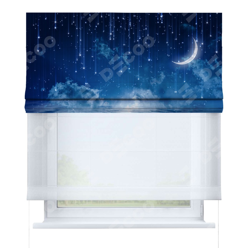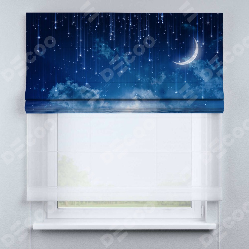Римская штора день-ночь производителя «Cortin», используется для проёма, пошита из двух полотен, с лицевой блэкаут с нанесением сублимационной печати «Ночное небо», вторая ткань тюль (по стандарту комплектуется тюль белого цвета артикул V-01). Имеет универсальный механизм и подходит для монтажа: на потолок, на стену и в нишу.