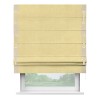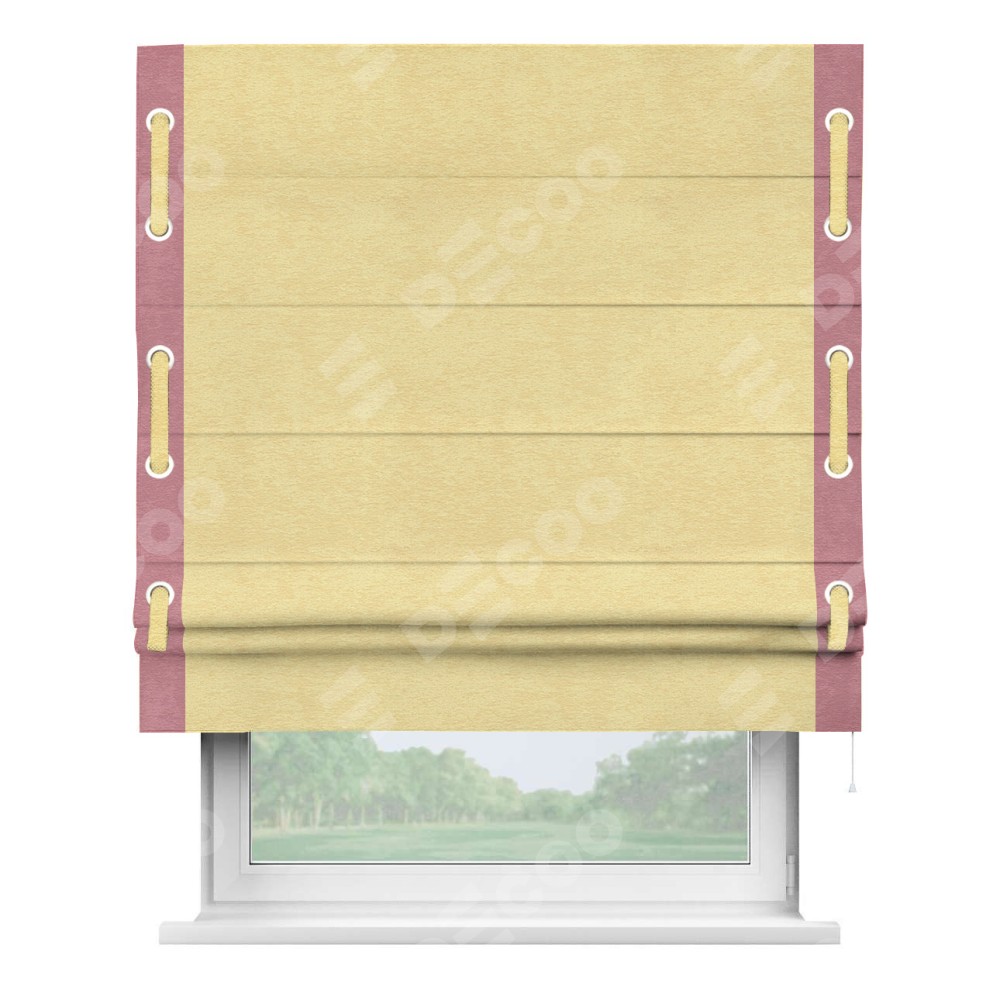 Римская штора производителя «Cortin», используется для проёма, пошита из ткани софт однотонный золотой, артикул 42934. Отделка шторы кантом «Стрим Дуо» на кантах расположены люверсы с пояском, ткань для канта используется из софта разной расцветки на выбор. Ткань для пояска обычно используется из основной ткани шторы, а так же можно сделать из любой расцветки по желанию. Имеет универсальный механизм и подходит для монтажа: на потолок, на стену и в нишу.