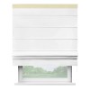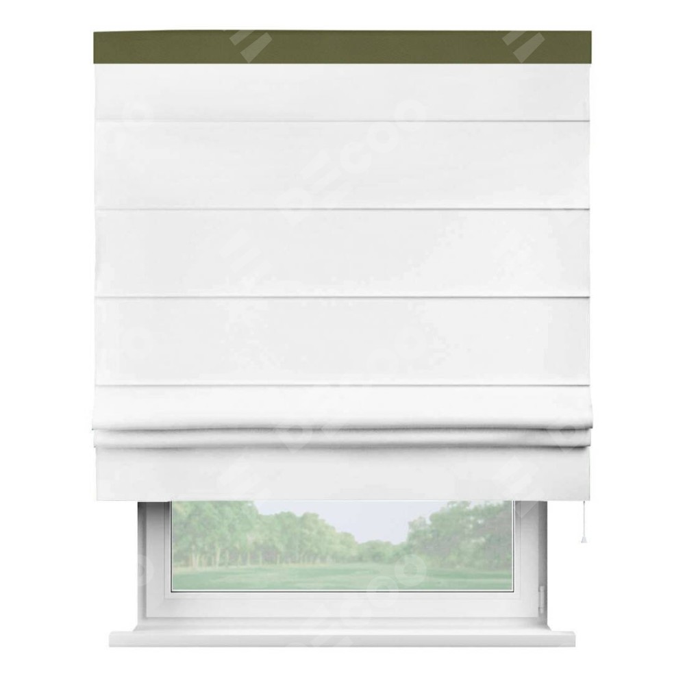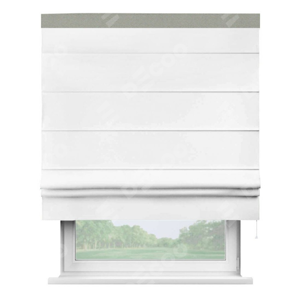 Римская штора производителя «Cortin», используется для проёма, пошита из ткани однотонная белоснежная, артикул ткани 41217. Отделка шторы кантом «Кинг», ткань для канта используется из блэкаута однотонного разной расцветки на выбор. Имеет универсальный механизм и подходит для монтажа: на потолок, на стену и в нишу.