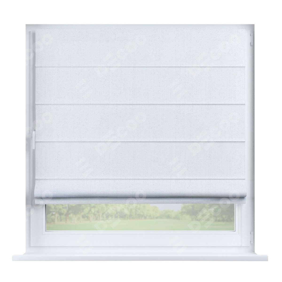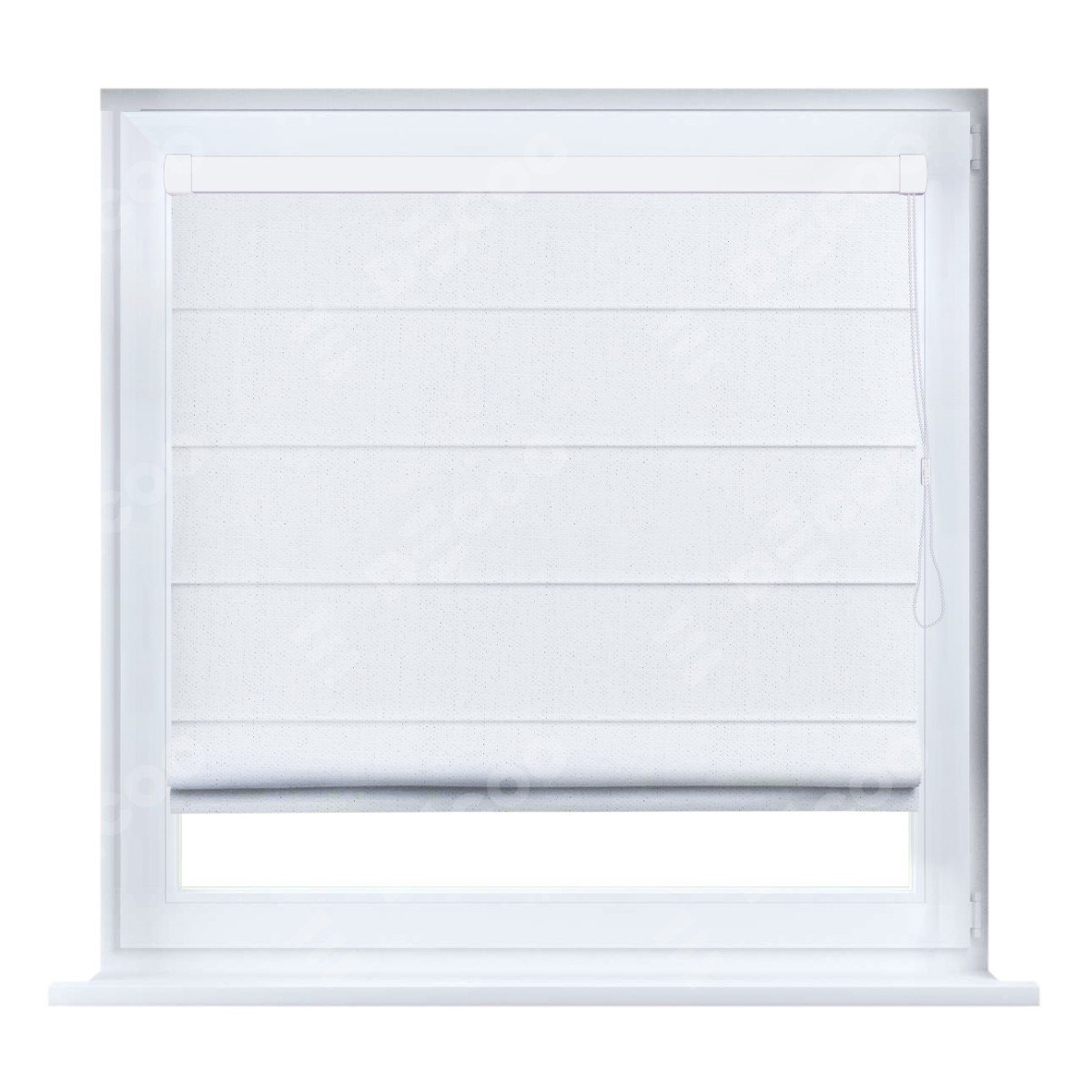 Римская штора производителя «Cortin», устанавливается на створку окна, пошита из ткани лён белоснежный, артикул 7438. Штора шьётся по индивидуальным размерам, для данного типа римской шторы возможная ширина от 35 до 150 см., высота до 250 см.