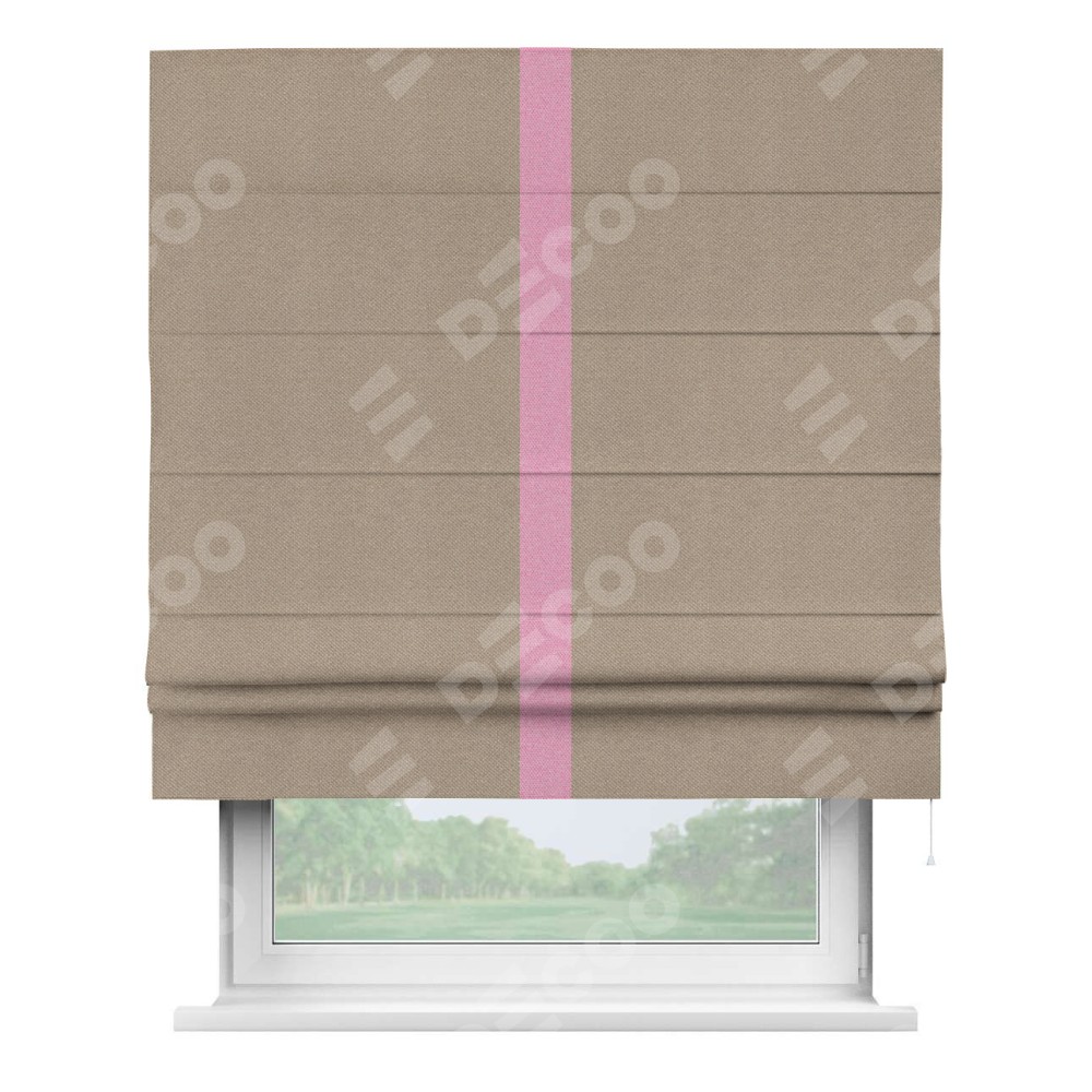 Римская штора производителя «Cortin», используется для проёма, пошита из ткани лён димаут светло-бежевый, артикул 2. Отделка шторы кантом «Хайвэй», ткань для канта используется из льна димаут разной расцветки на выбор. Имеет универсальный механизм и подходит для монтажа: на потолок, на стену и в нишу.