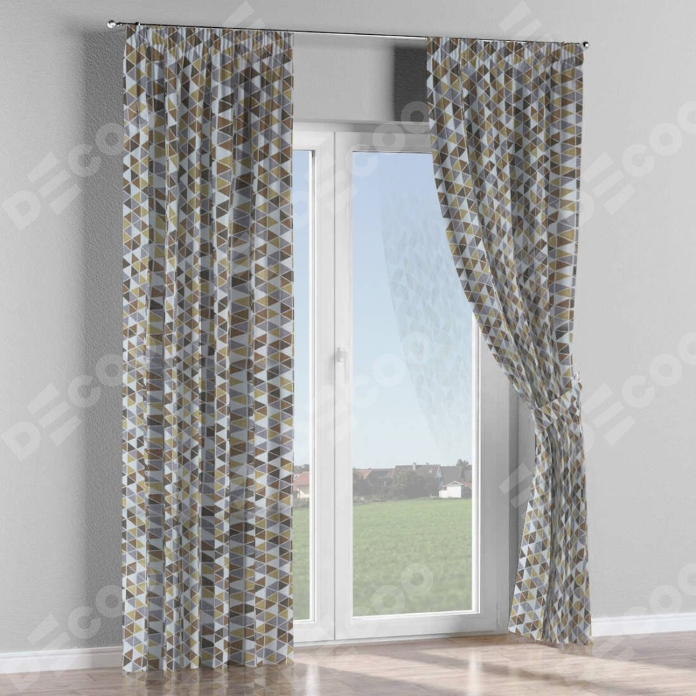 Комплект прямых штор, от производителя «Cortin», пошиты из ткани димаут «Треугольники коричневые», артикул ткани 23021. С изнаночной стороны в верхней части штор пристрачивается шторная лента с декоративными складками «Карандаш». Для создания элегантных складок прямые шторы шьются по стандарту с коэффициентом 1:2 (на 100 см. ширины проёма 200 см. ширины ткани).