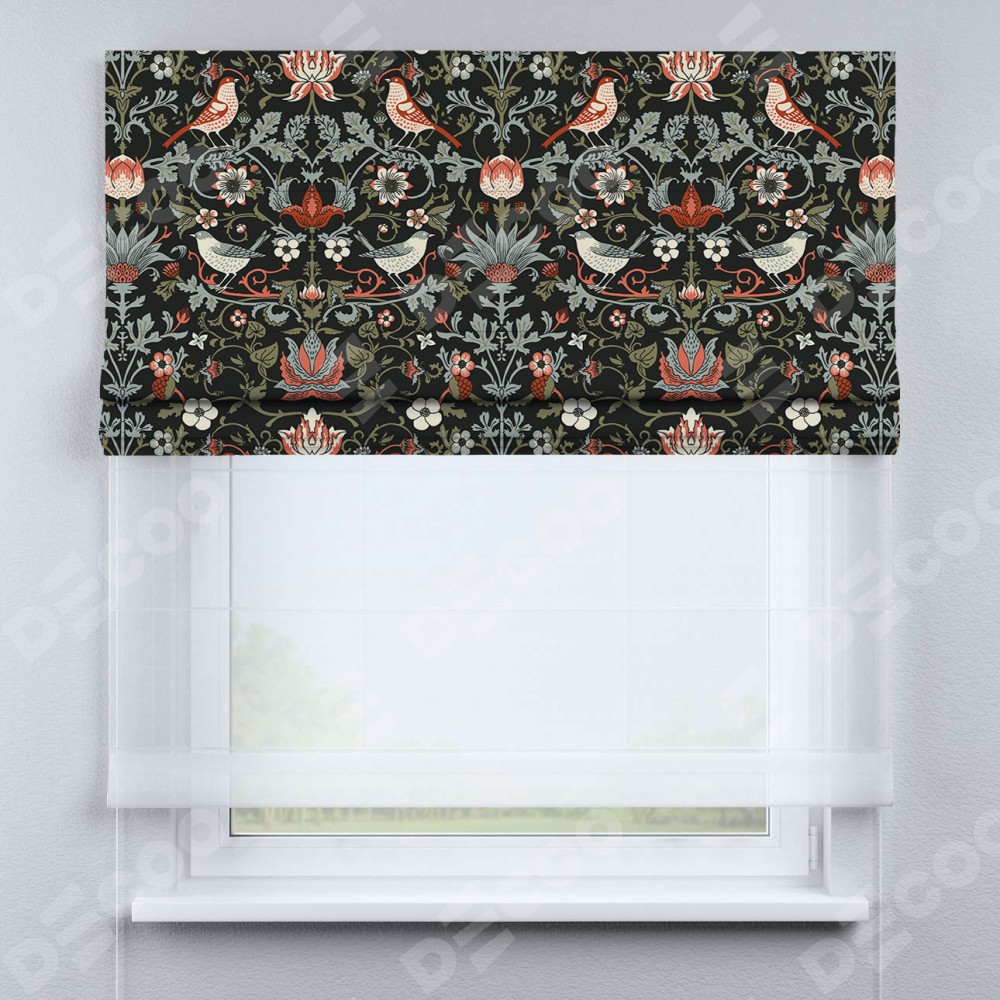 Римская штора день-ночь производителя «Cortin», используется для проёма, пошита из двух полотен, с лицевой блэкаут с нанесением сублимационной печати «Зачарованные птицы», вторая ткань тюль (по стандарту комплектуется тюль белого цвета артикул V-01). Имеет универсальный механизм и подходит для монтажа: на потолок, на стену и в нишу.