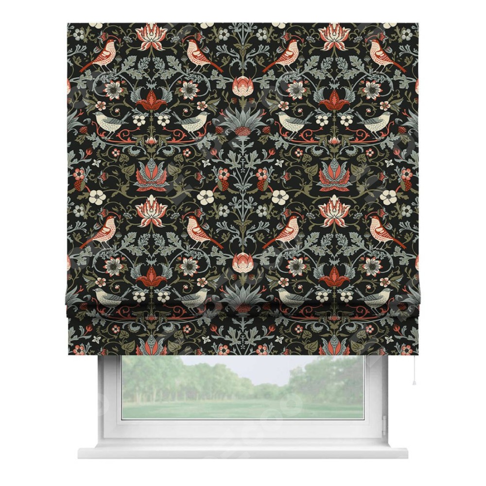 Римская штора производителя «Cortin», используется для проёма, пошита из ткани блэкаут с нанесением сублимационной печати «Зачарованные птицы». Имеет универсальный механизм и подходит для монтажа: на потолок, на стену и в нишу.